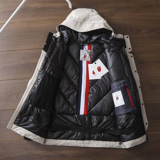 Carefully Selected Goods! Moncler x Rolling Stones Collaboration Men's Hooded Down Jacket! Trading Company Order! Imported coated windproof and waterproof fabric, 90% white goose down filling, lightweight, fluffy, comfortable and warm! Features include multiple seam-sealing processes, laser-perforated breathable valve on the placket, multiple pockets, collaborative badges on the sleeves, waterproof zipper, adjustable snap closure at the waist, ribbed windproof cuffs, original molded hardware, impeccable workmanship and details, quality guaranteed. Don't miss it! Colors: Black, White! Sizes: 1-9, M-3XL!