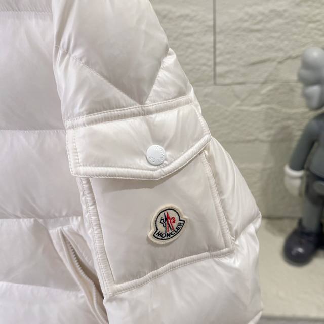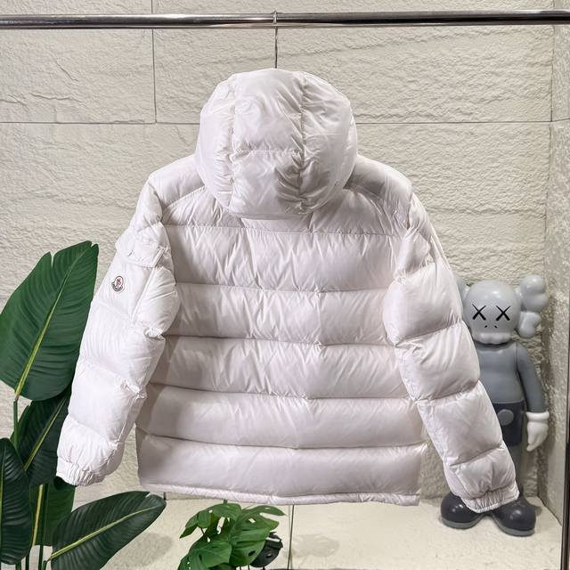 High-quality Moncler Maire women's Mayan-style short down jacket, fashionable and warm. Made with classic Mayan fabric: technical nylon with a glossy finish. Highly loft with over 90% down filling. The Maire down jacket is designed for those who appreciate well-designed basics; it's a classic Moncler style and a popular choice. Made from signature lacquered nylon, the Maire down jacket is a classic Moncler women's piece, its short design showcasing timeless style. Made from lacquered nylon, it offers a comfortable fit, a detachable hood, and high-performance details for enhanced comfort and warmth. Made of coated nylon, coated nylon lining, filled with white goose down, detachable hood with snap buttons, zippered closure, zippered pockets, adjustable snap cuffs. Maire Women's Down Jacket. Colors: White, Pink. Sizes: 00, 1, 2. Measurements: Chest, Length, Shoulder Width, Sleeve Length: 00: 113, 64, 48, 59; 0: 117, 66, 50, 60; 1: 121, 68, 51, 61; 2: 125, 70, 53, 62.