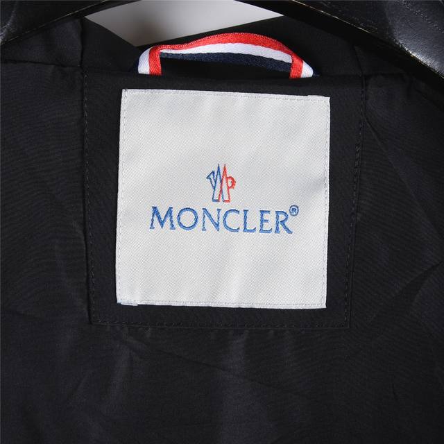 Moncler 25Fw Logo Embroidered Sleeve Pocket Zip-Up Hooded Jacket. Made from 100% polyester, this jacket features a soft, fine fabric. Precise tailoring creates a fitted silhouette around the shoulders and chest. The hood is adjustable with a drawstring and elastic. The brim is embroidered with a precise, three-dimensional brand logo using a computer-controlled embroidery process, adding to its aesthetic appeal and depth. The hood extends to the placket for enhanced wind protection and warmth. The zipper closure features a drawstring detail, neatly concealing the zipper for a more aesthetically pleasing look. Side pockets are located on both sides, secured with interlocking closures. A flap pocket on the left sleeve, with a snap closure, adds practicality. The arm pockets are adorned with the brand's iconic logo for easy identification.