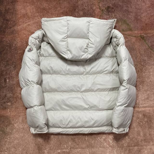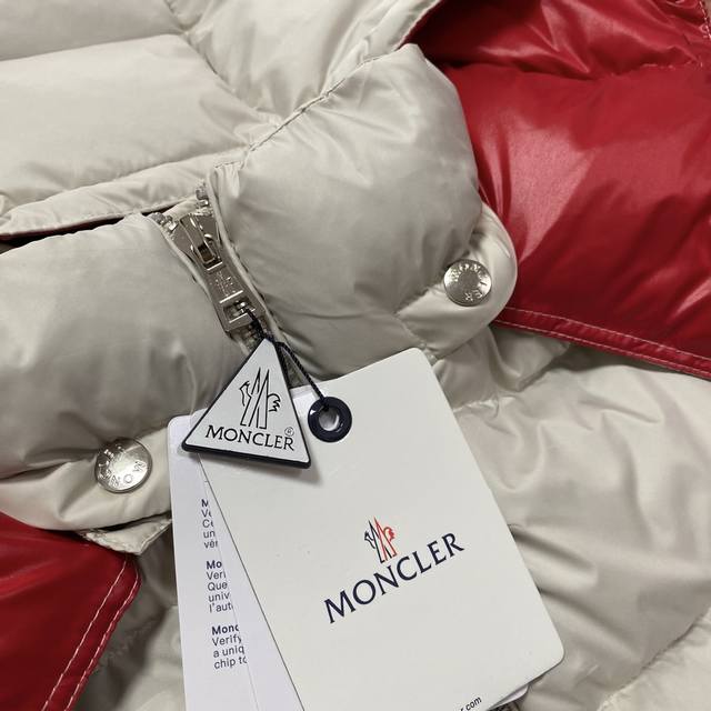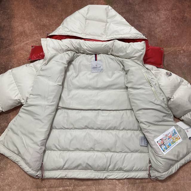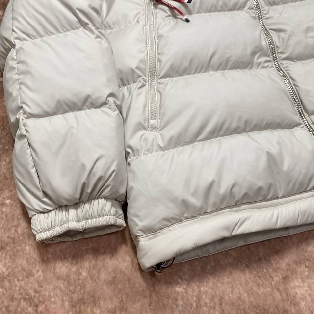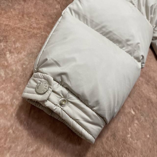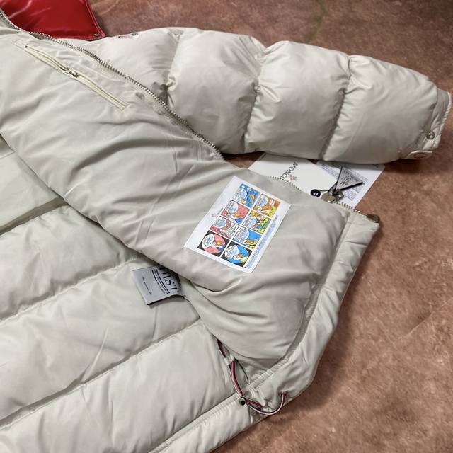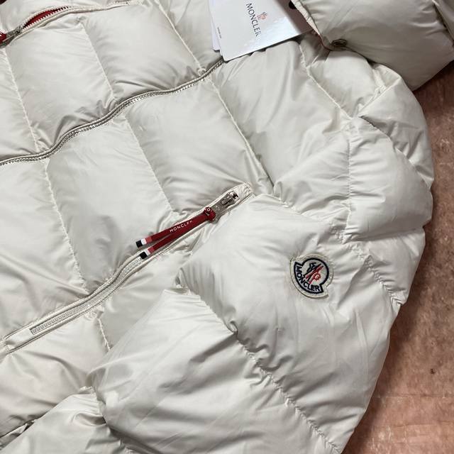 Moncler 90% White Duck Down Filled Poirier Down Jacket. Inspired by 1960s skiing, this stylish jacket is made from tight-fitting nylon fabric, offering excellent breathability and functionality. The hooded design is a testament to Moncler's expertise in fabric research. Berry-colored details on the brim and zipper add a touch of freshness. Unisex. Color: Off-white. Sizes: M, XL, DDD