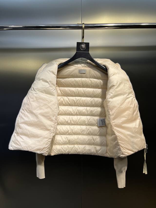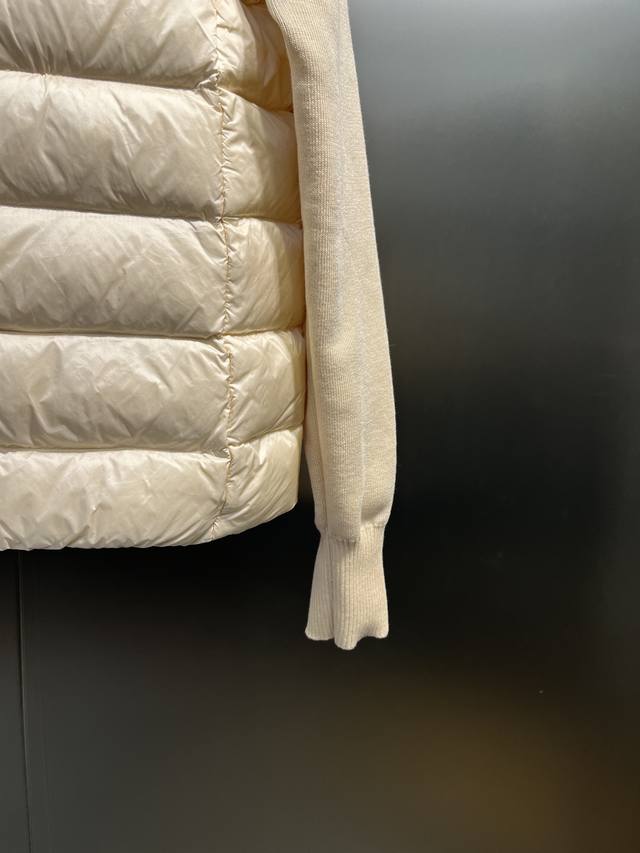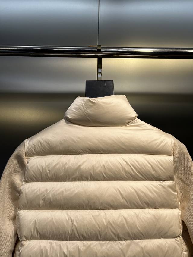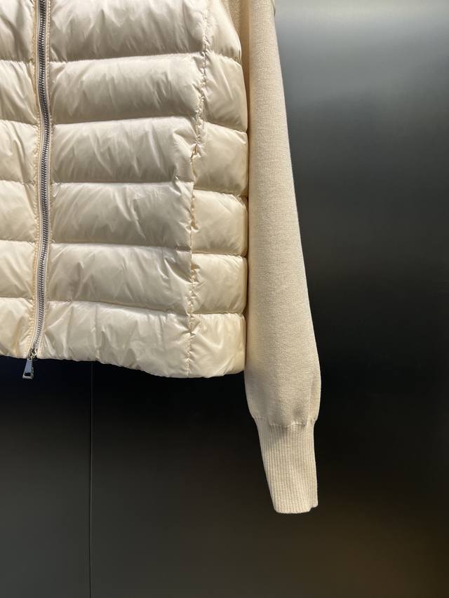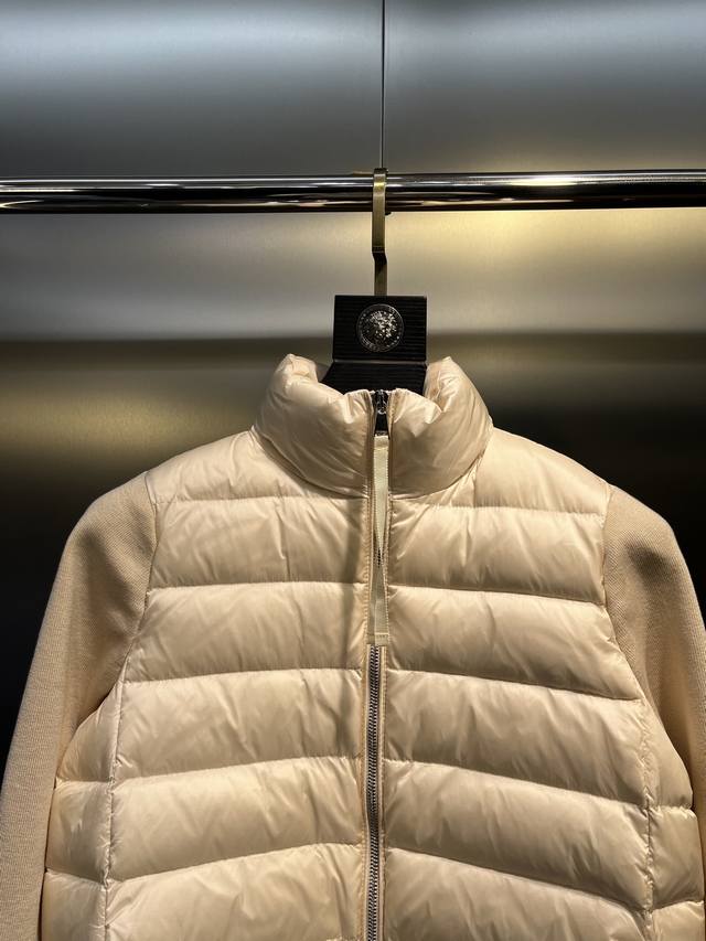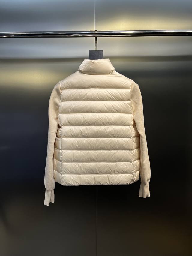 Moncler Autumn/Winter Newest Wool Knitted Down Jacket with Stand Collar, Lightweight and Comfortable with Self-Heating and Warmth. Sleeves are made of Merino wool for a comfortable and thick feel. The stand collar and zipper design exude a sophisticated and minimalist luxury. The H-line silhouette is flattering and slimming, making it a versatile and stylish piece. It boasts Italian elegance and a high-class feel, exuding a casual yet sophisticated vibe. Colors: Black, Beige, Pink. Sizes: S, M, L.