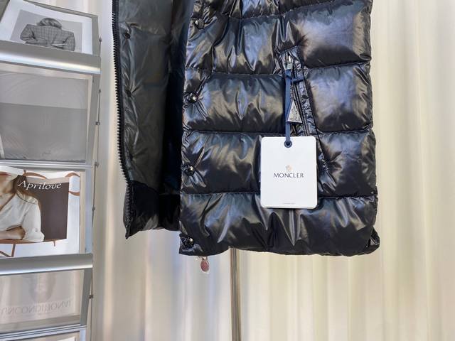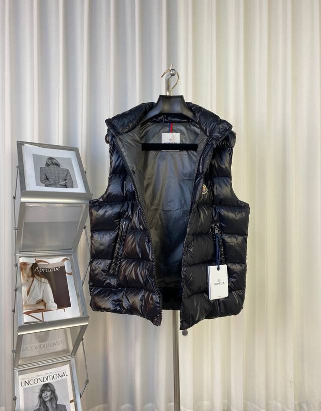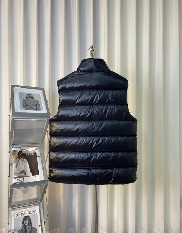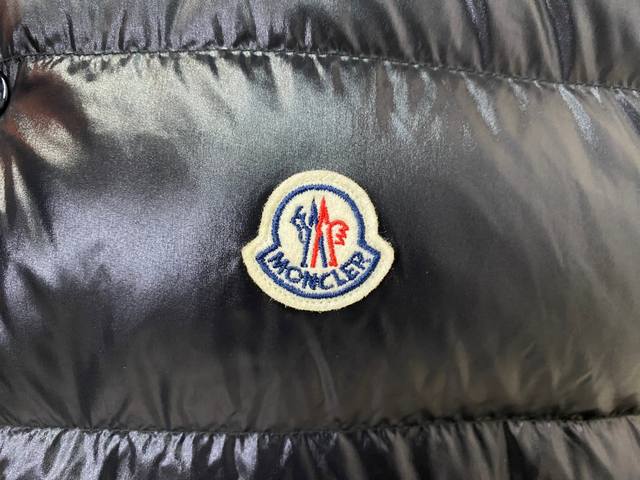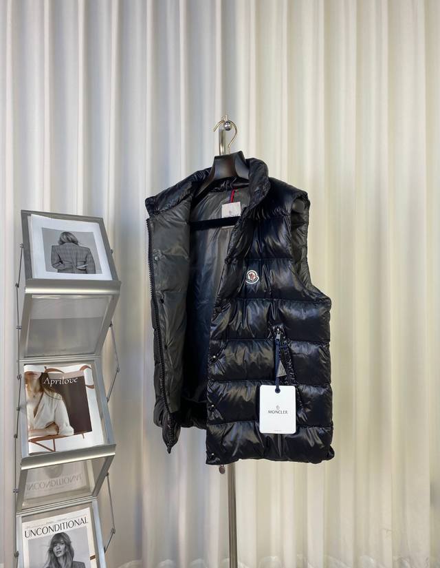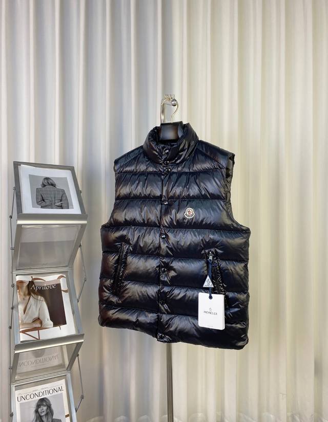 Moncler Down Vest This down vest is Moncler's reinterpretation of a classic piece, drawing inspiration from iconic 80s styles. Made of patent nylon, it can be worn as an urban outerwear piece during transitional seasons or as an undershirt in colder weather. Features: 1. Rectangular seams, filled with white goose down (90% down content, 100g)! 2. Fabric: 100% nylon, patent lining, dark gray lining. 3. Zipper and snap closure, two external pockets on the left and right sides. 4. Small stand-up collar, hood, classic felted wool logo on the left chest. Sizes: 1-6, unisex.