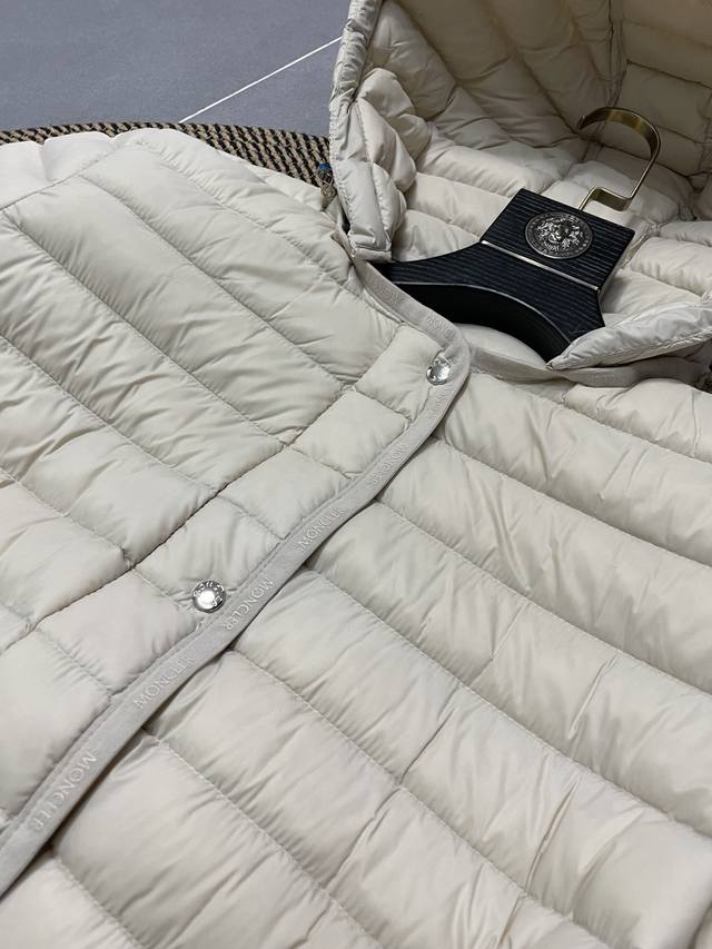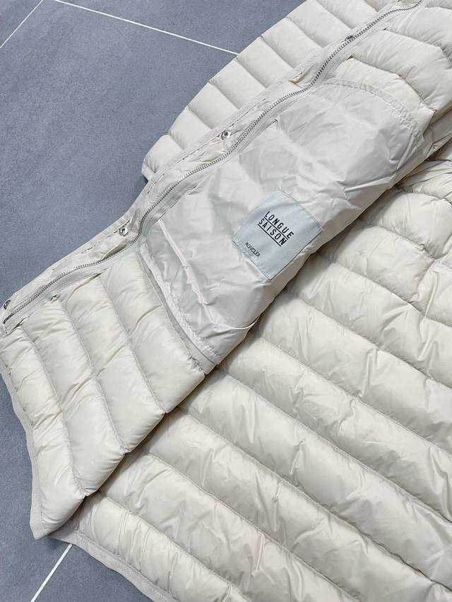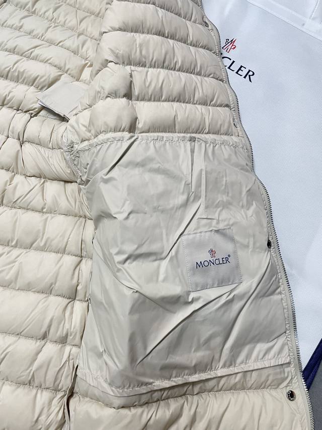Moncler shell down jacket, 100% polyamide; filling: 90% down, 10% feathers; lining: 100% polyamide. Concealed zip fastening at front. Regular fit. Drawstring hood. Long sleeves. Elasticated sleeve hem. Brand emblem on sleeve. Two straight front pockets with snap fastenings. Waist belt. Partially elasticated waist. Quilted pattern. Brand logo in silver.