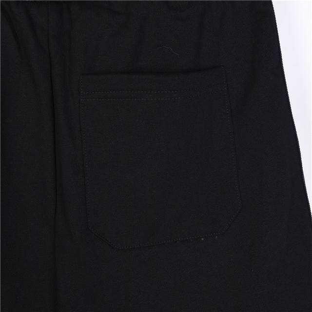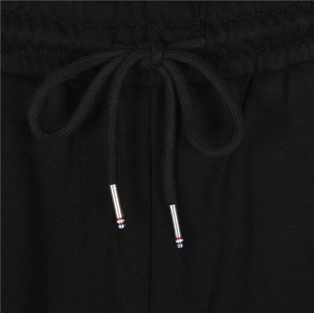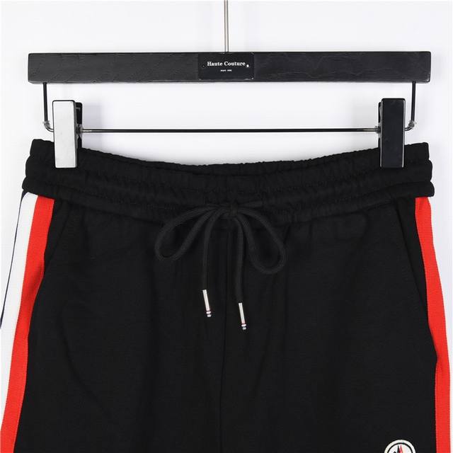 The waist is equipped with elastic drawstrings, and the drawstring details are equipped with 3 colors of red, white and blue on the head, which correspond to the color stripes of the shorts. The front of the
