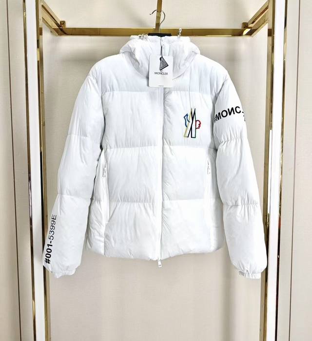 Moncler Solayan Three-Label Logo Down Jacket. Featuring seasonally iconic decorative details, this Solayan down jacket blends sporty spirit with timeless style! Premium down filling standards for loft and warmth. Made from Micro Chic fabric, this no-wash, structured square-cut jacket embodies Moncler's sporty spirit. Colors: Black, White. Sizes: M-2XL.