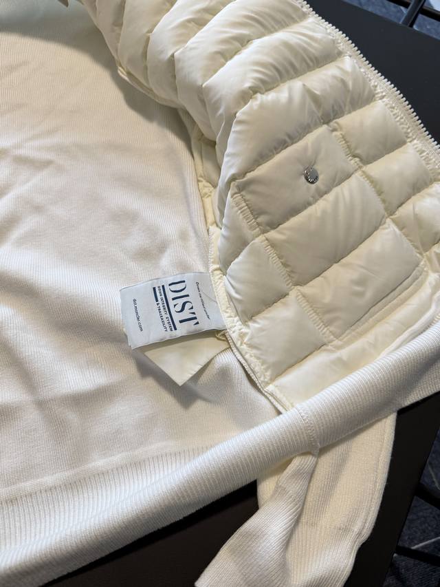 Moncler Stand Collar Knitted Down Jacket for Women. The sleeve fabric is made of the same pure wool material as the original, and the filling is high-quality 90% white goose down, offering lightweight fluffiness and excellent warmth. The quilted design features a curved texture, a type of stitching technique that secures the down and prevents leakage, and is also an important decorative element. The stitching is crucial; fine stitches better lock in the down, and a large logo adorns the back. Hardware is identical to the original; the zipper uses a YKK brand zipper for smoother and more durable operation. The buckles, cuffs, and hem feature windproof ribbed design and an adjustable drawstring. Custom-woven and dyed, with no color difference from the original. Exquisite craftsmanship perfectly replicates the original, complete with all three labels and custom accessories . Color: White. Size: 1 2 3 4.