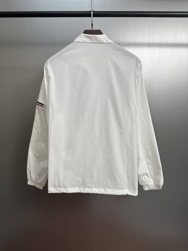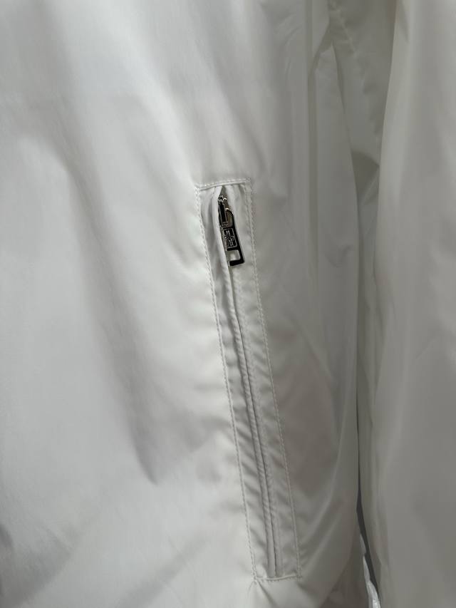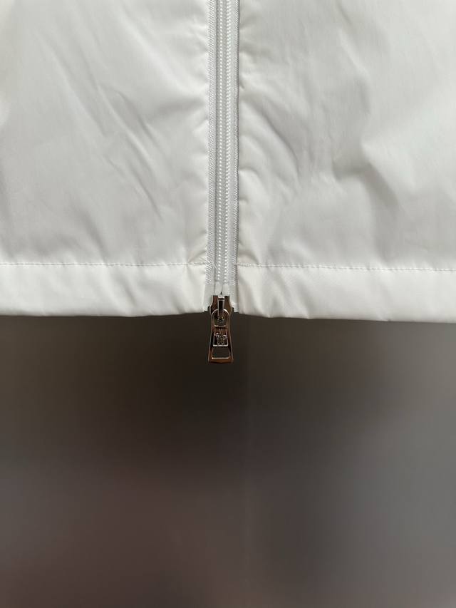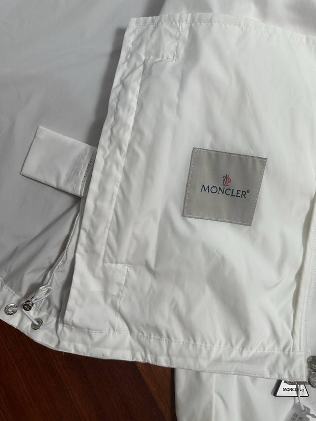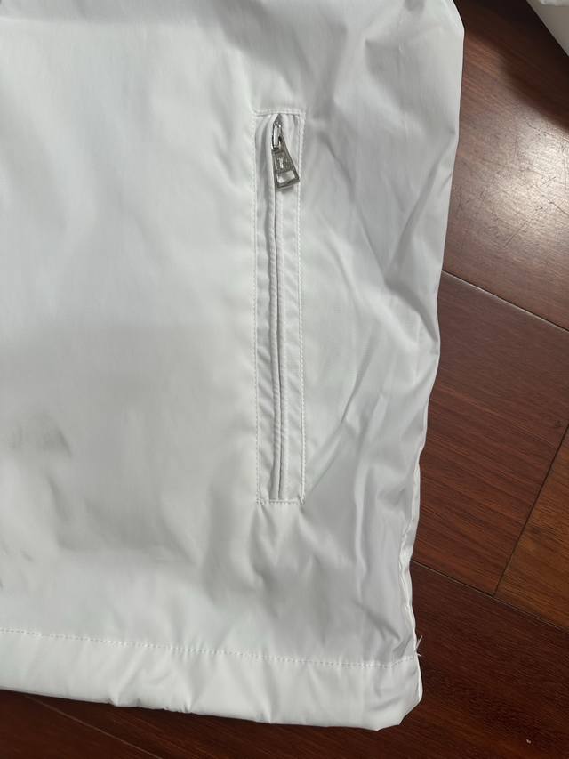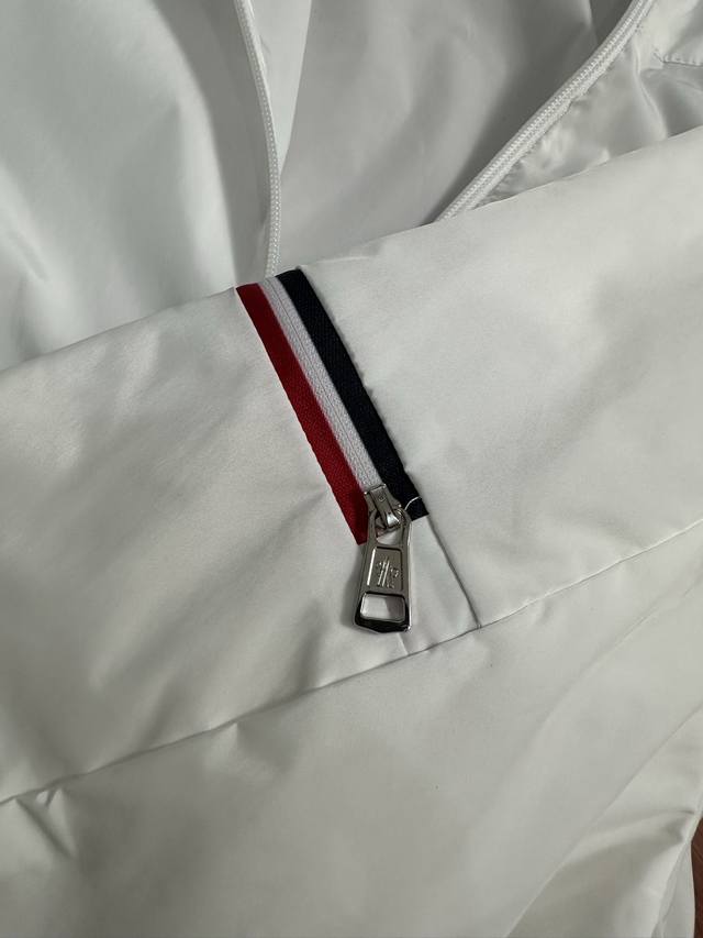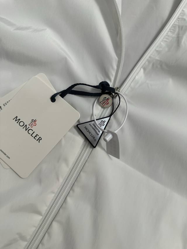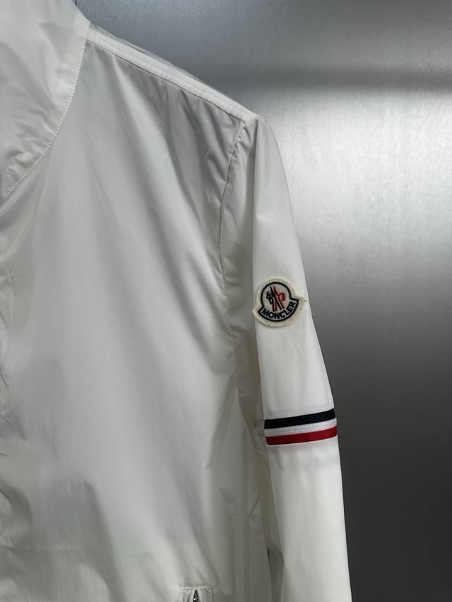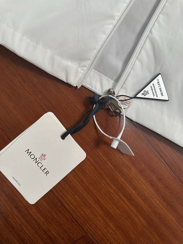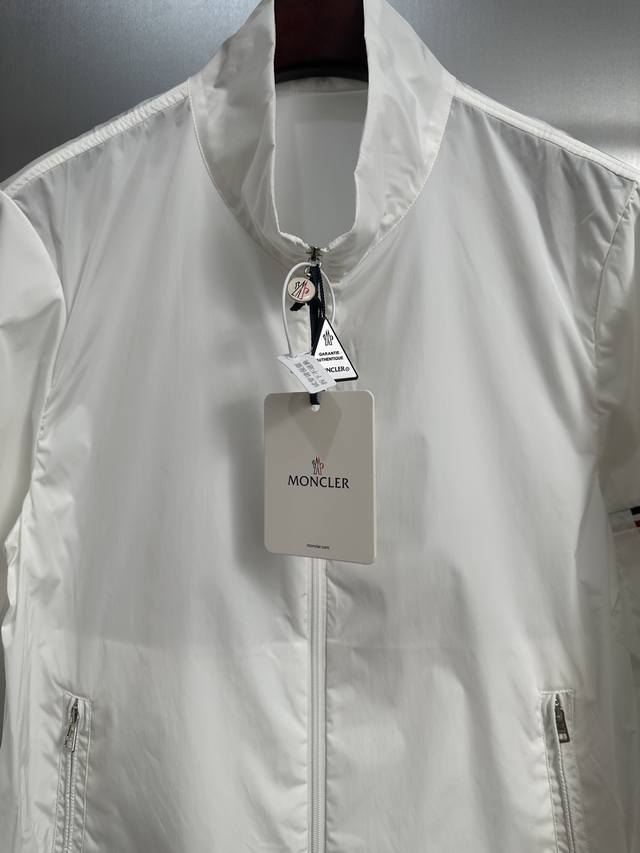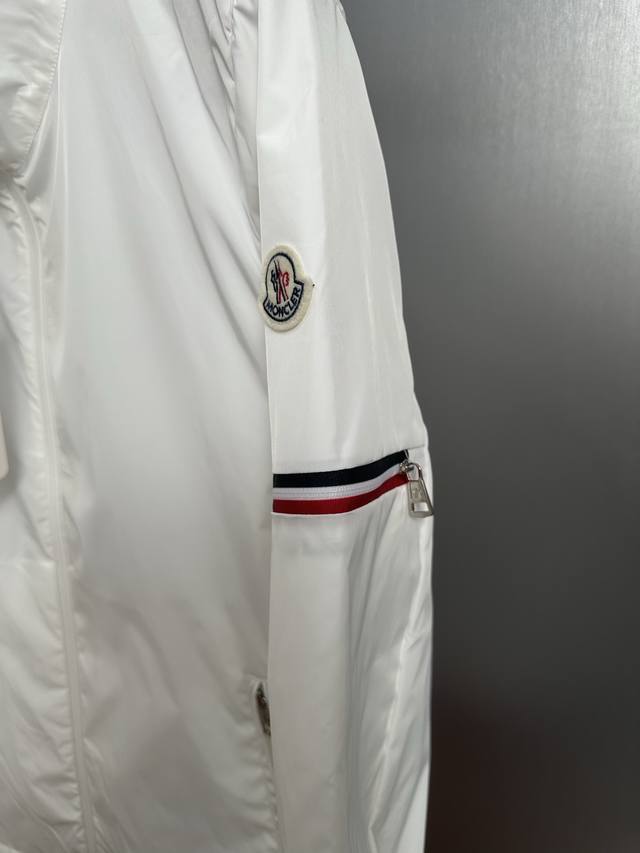 Moncler Stand Collar Water-Repellent Jacket. Original fabric with a coated finish for water repellency. Custom-made fabric is stiff yet slightly soft, unlike the very stiff and rigid fabric found on other coated jackets. Original hardware with a 1:1 custom logo. Dual-chip sensors on the sleeve label and care label. The sleeve label features original, top-quality embroidered cashmere, making it the closest to the authentic cashmere label. Reject fake cashmere labels; they are easily identifiable as counterfeit. Color: White. Sizes: M-2XL.