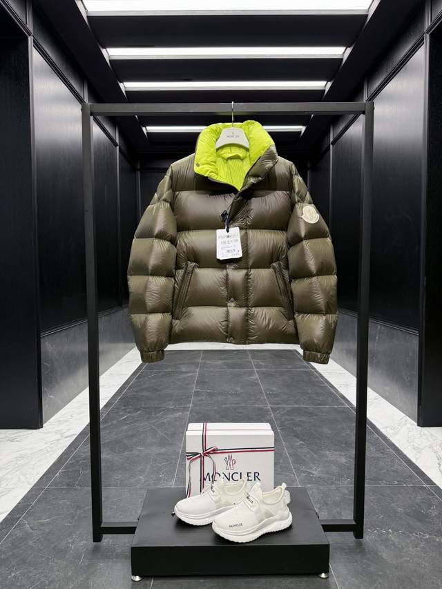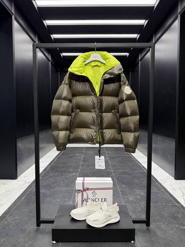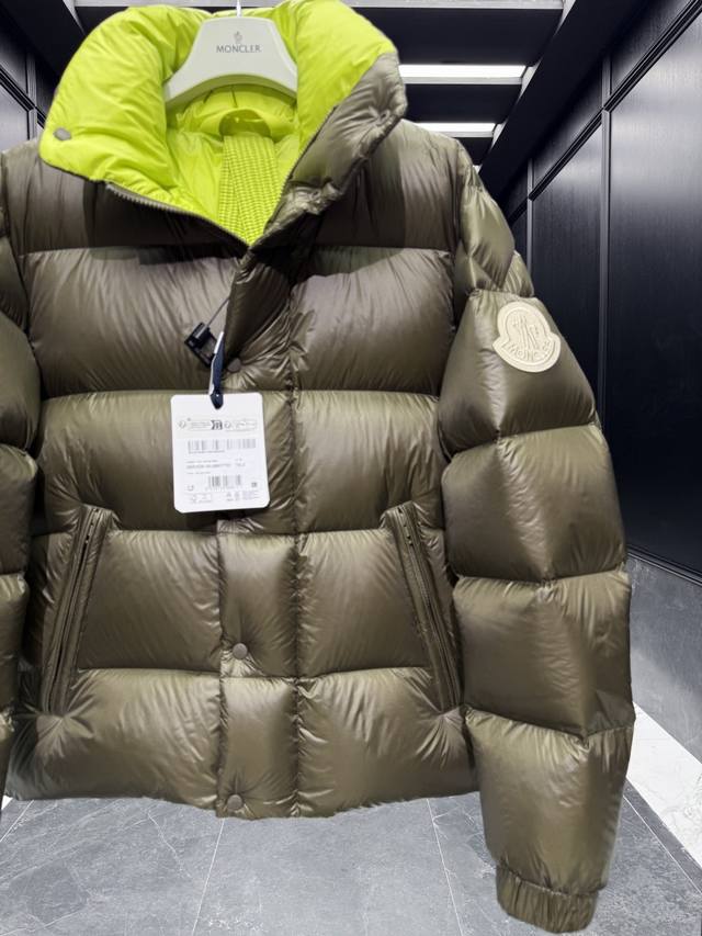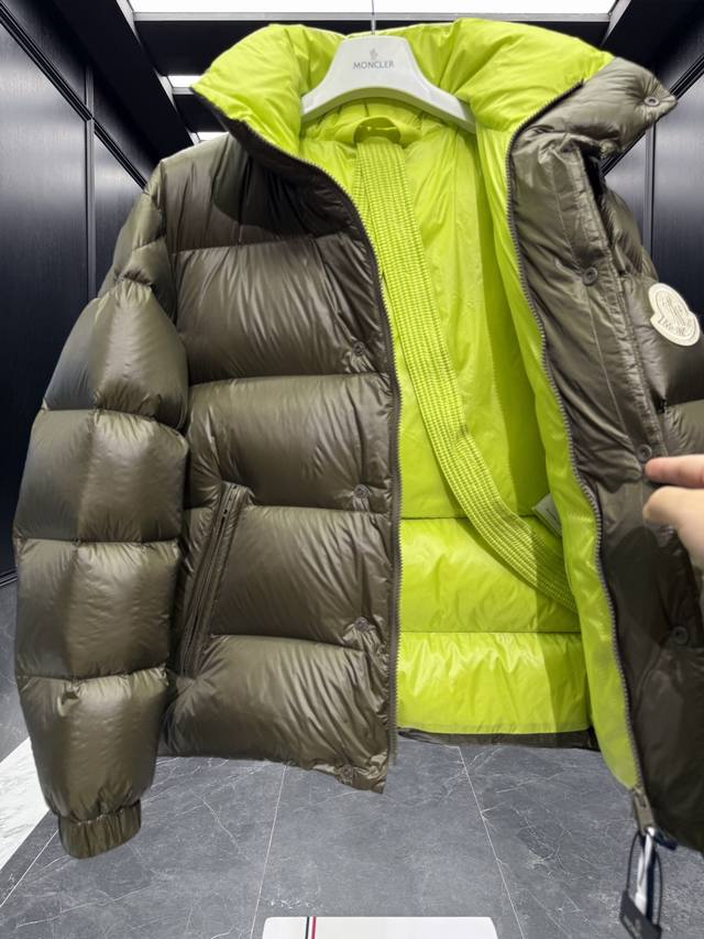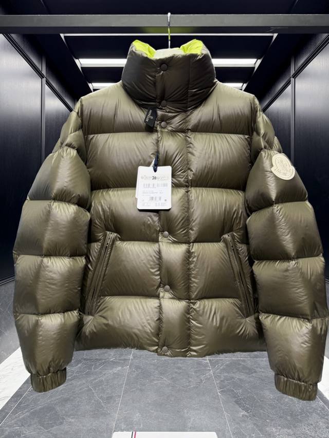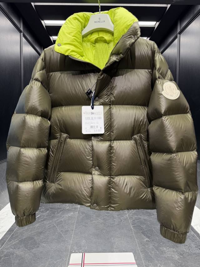 Premium Down Moncler Dervox Short Men's Down Jacket. This Dervox men's short down jacket features a pop art color scheme, showcasing the series' vibrant energy. A brand new olive green "fat" version. Super down-filled, distinguishing it from the "skinny green" duck down jackets on the market. 95% European standard goose neck down filling. Extremely full filling. 850+ fill power. The hangtag barcode and style number match the official website. The hangtag has a built-in NFC electronic anti-counterfeiting feature. Comes with a complete set of counter gift box packaging: original box, original shopping bag, original dustproof bag, original hanger, original thank-you card, original ribbon, and upgraded original extra-large magnetic gift box. Made from lightweight Nylon Laqu