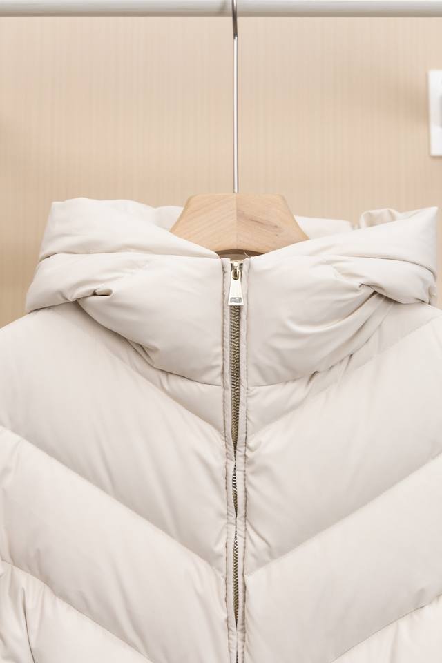 Customized Yb imported windproof and waterproof nylon material, white goose down filling inside, the whole piece is light and warm, with rectangular strips and V-shaped embossed quilting, fashionable and advanced silhouette, full, crisp and three-dimensional style, regular hooded down jacket cut with hooded collar makes the style more casual and personalized, while taking into account warmth and practicality, comfortable and suitable for everyone, the iconic badge decoration on the outside of the arm reflects the brand concept, the waist is matched with a detachable elastic band to adjust the waistline, the first choice for lightweight and fashionable down jackets in autumn and winter, customized fabrics and accessories, look for the version filling standard: national standard 90 down filling material: white goose down high version