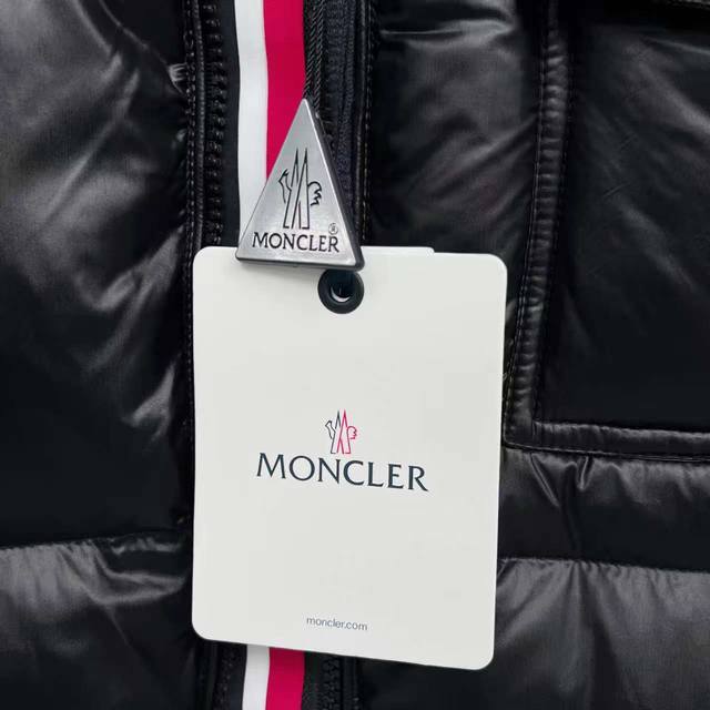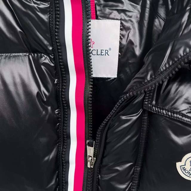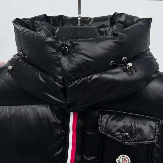 Mom Let Moncler Three-Color Webbing Down Jacket. This jacket features a double-zipper design. It's decorated with red and white striped webbing, giving it a stylish and distinctive look. This contrasting color design is very eye-catching in winter. Suitable for harsh outdoor environments, it can also be a fashionable urban outfit. It's a typical example of combining functionality and style.