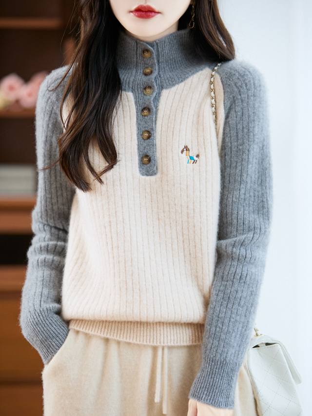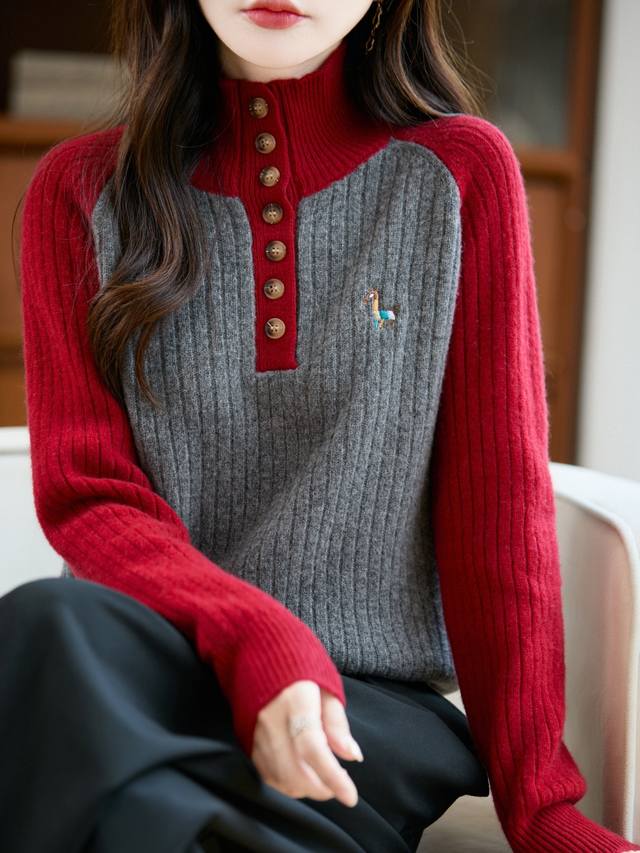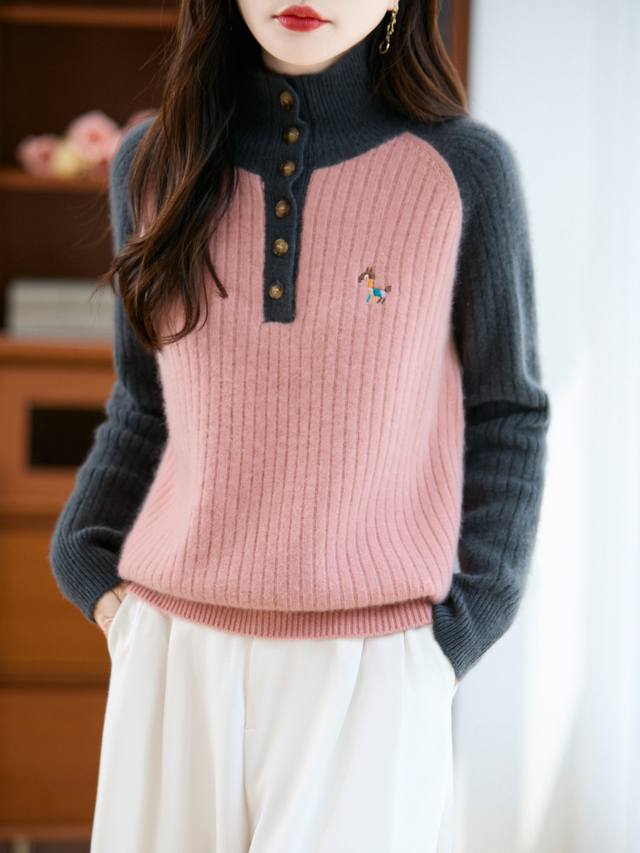 100% wool seven-needle thickened stand-up collar embroidered sweater