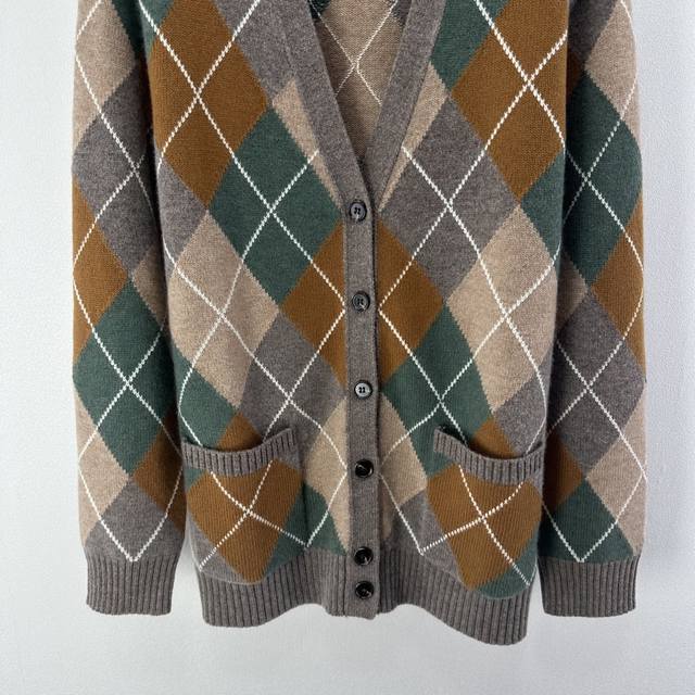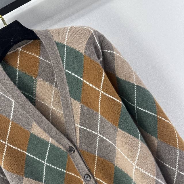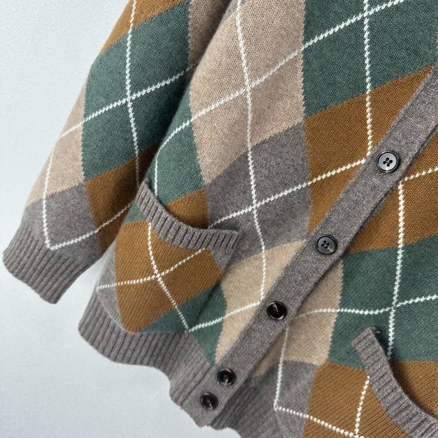 1:1 DDD Lp New Arrival Details DDD Autumn/Winter New Arrival Diamond Pattern V-Neck Knit Cardigan, khaki, brown, and green color blocking, full of retro preppy style! Made of wool blend, soft and warm, perfect for autumn and winter wear~ The V-neck flatters the neckline, and the loose fit is relaxed and casual, pairing well with corduroy pants or jeans. Easily suitable for daily commutes or casual wear, exuding a youthful and artistic vibe! DDD 1 color, 3 sizes (S, M, L) DDD