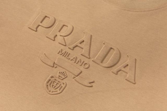 1210, high-end customization, exclusive and highest quality version of Pra* logo embossed round neck short-sleeved T-shirt, using exclusive customized 290G original 1:1 double-strand double-yarn pure cotton fabric, custom-woven and dyed in the same vat without color difference ribbing, customized 1:1 accessories, three labels complete, oversize loose version, fine workmanship, perfect workmanship, soft and comfortable fabric without deformation, same style for men and women, different market versions, specializing in high-end top products, welcome to compare quality at will.