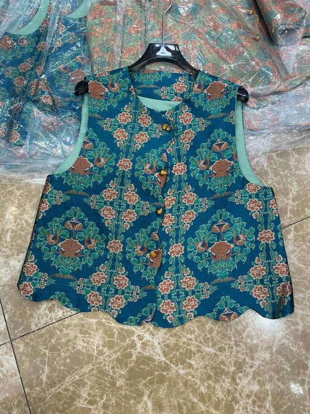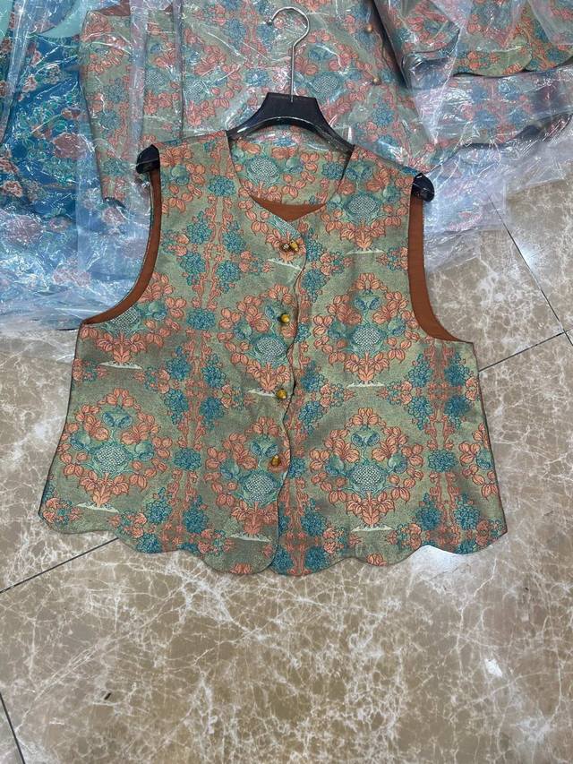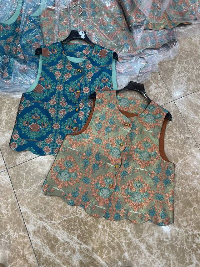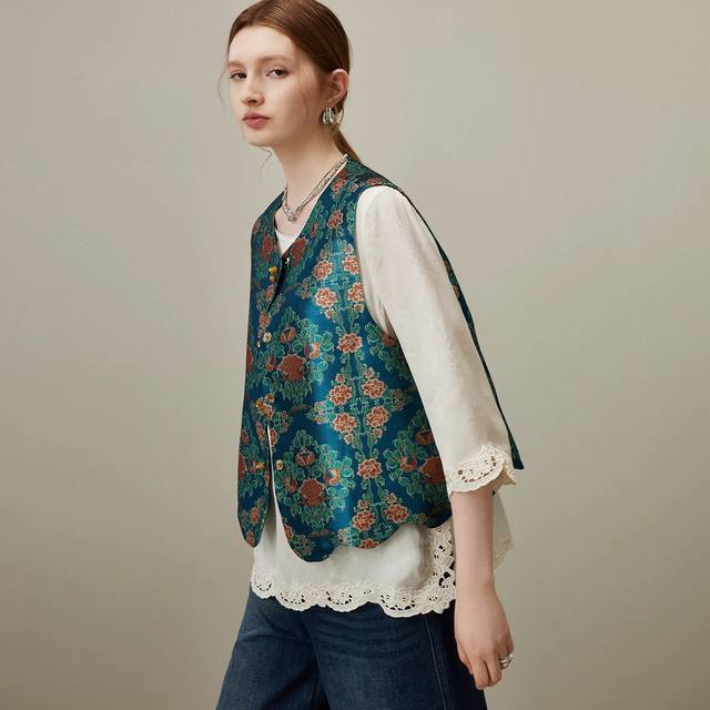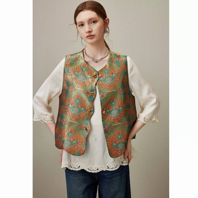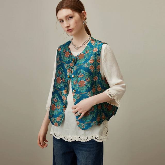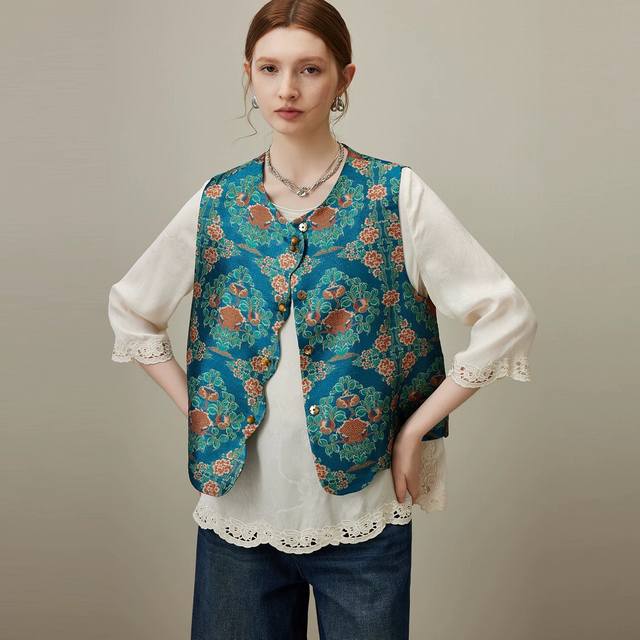 2025 autumn new round neck new Chinese style jacquard vest Color: blue, coffee S
