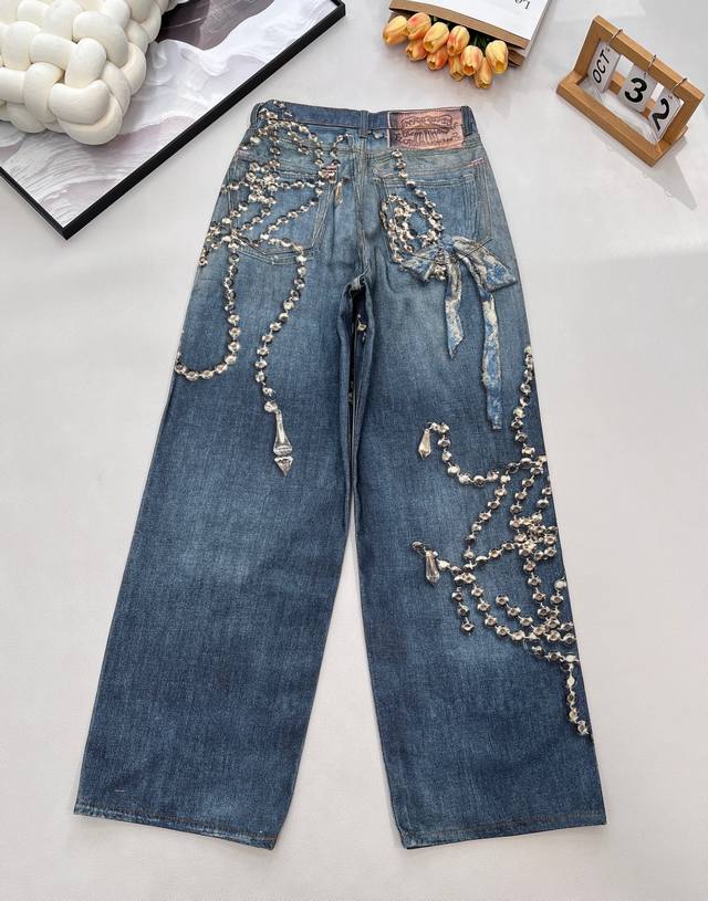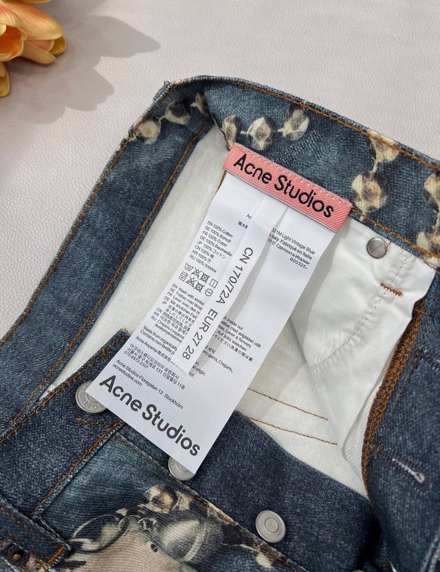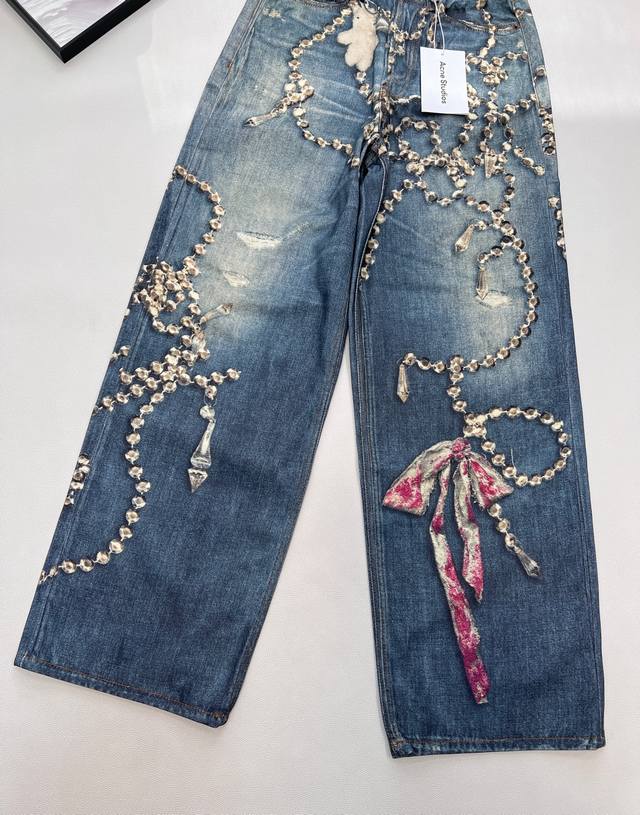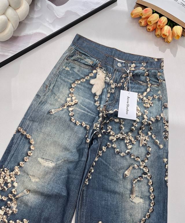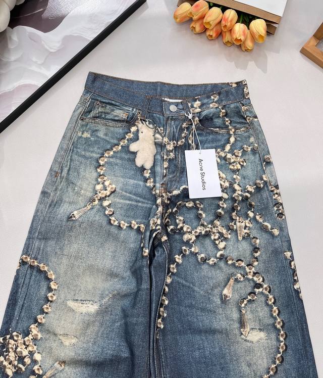 2025 Autumn/Winter New Acne Studio* 3D Printed Crystal Illusion Chain Jeans. Acne's annual best jeans, the 1981 cut is incredibly easy to wear and flattering. Features include 3D printed illusion prints, a relaxed wide-leg style, button and fly closures on the front, and a logo micro-label patch on the back. Continuing the gender-neutral style, these jeans are both fashionable and practical, easily paired with any outfit for a unique look. The vertical lines are perfect, and the fit is excellent. Developed to order, this is a 1:1 replica. Jeans have always been a fashion favorite, and these wide-leg jeans offer a perfect body proportion and undeniable presence! Wearing them will instantly make you the focus of street fashion! Available in 4 sizes, color oil paint, all three tags included. Bulk order, Ddd size. Sizes 26 27 28 29 Ddd. Code A. DDD