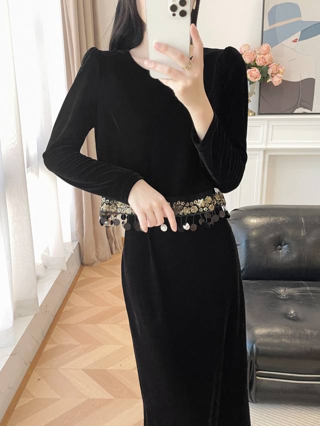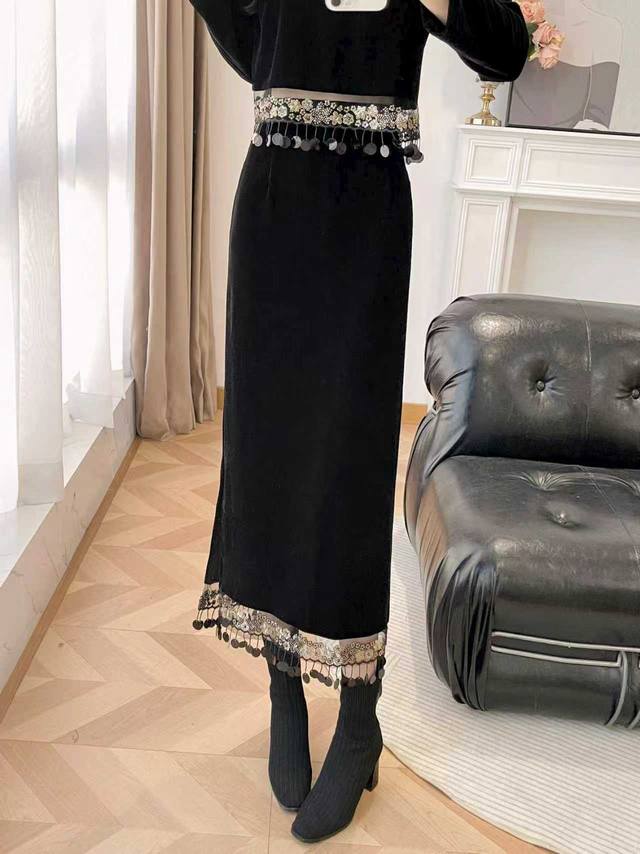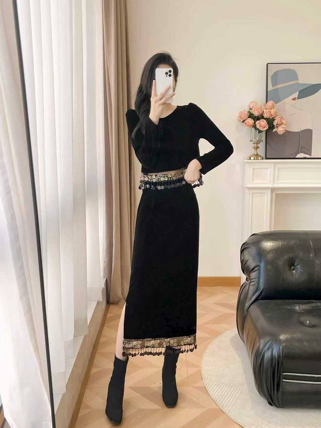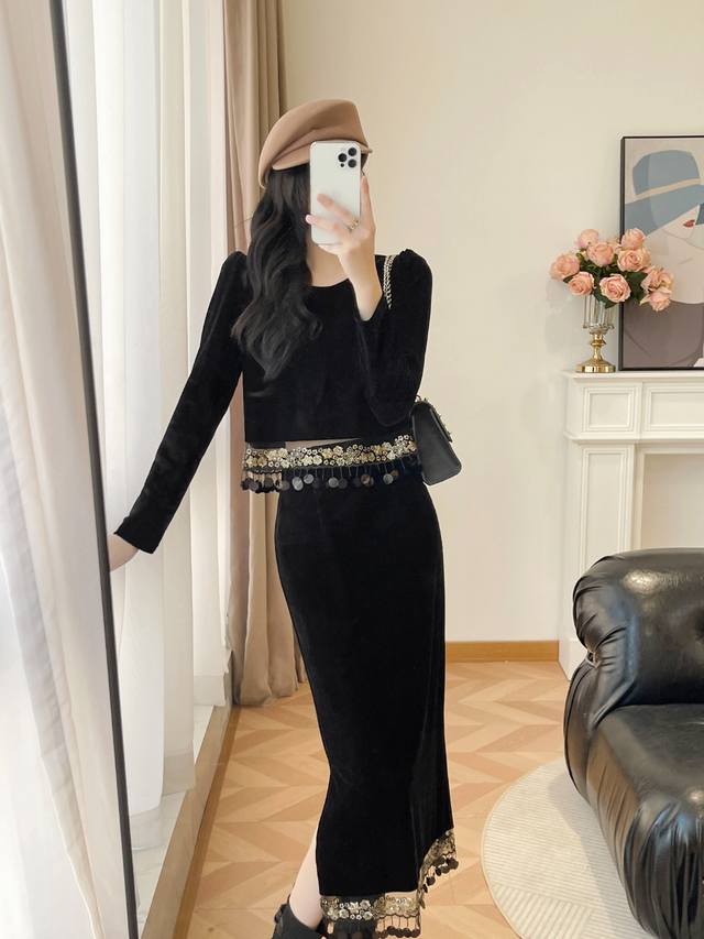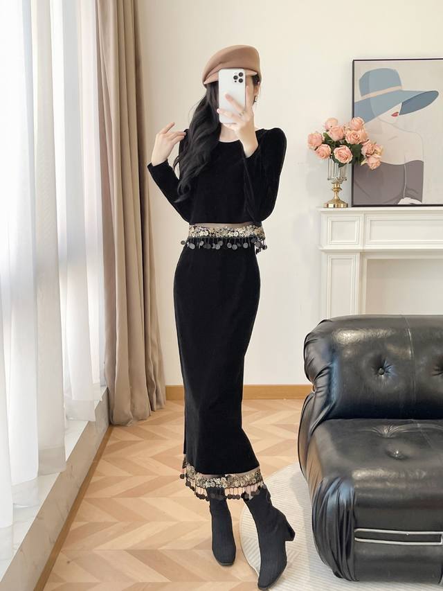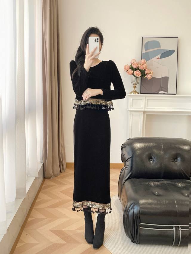 2025 Autumn/Winter New Arrival French Light Luxury Elegant Velvet Patchwork Tassel Bodycon Dress Two-Piece Set S-XXL In Stock DDD