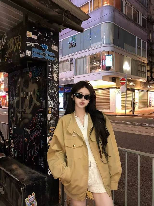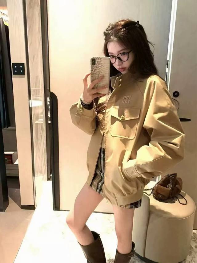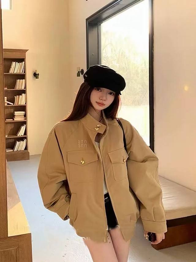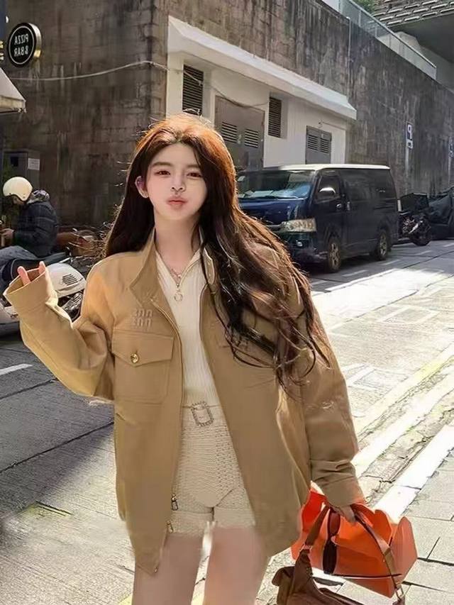 / 2025 Early Autumn New Miumiu Letter Pocket Retro Stand Collar Workwear Jacket