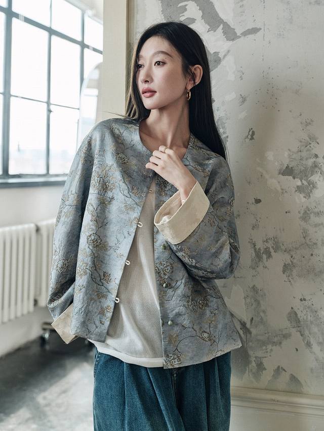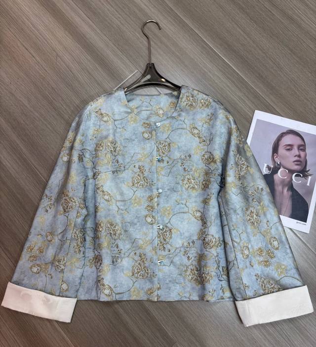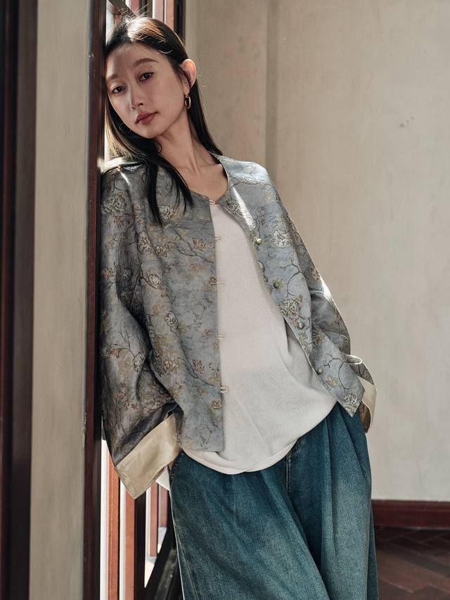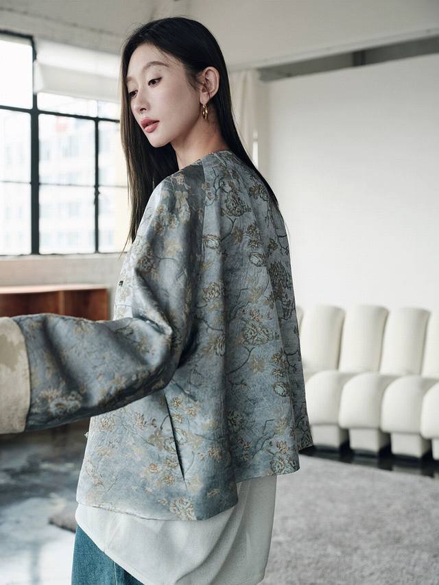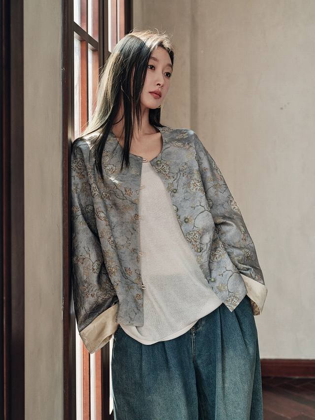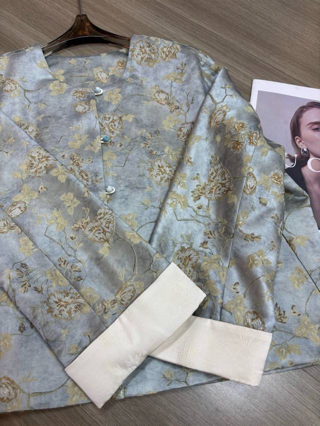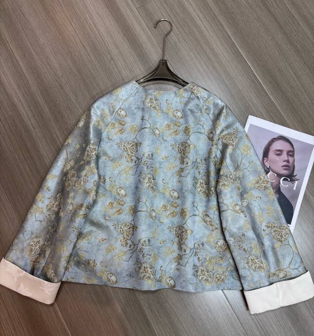 New Chinese style silk wool jacquard printing and dyeing contrast color jacquard cuffs three-dimensional silhouette loose fashionable versatile jacket