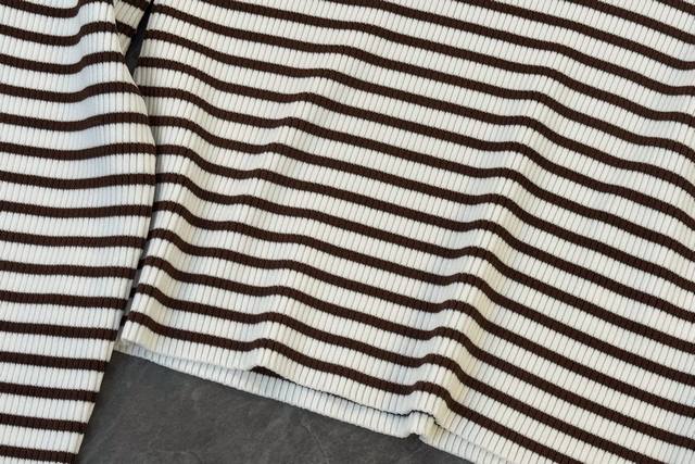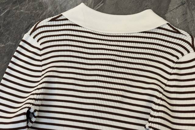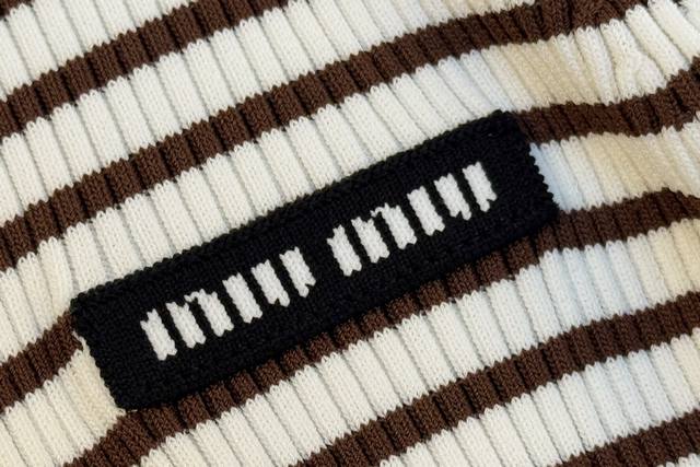 2025 New Miu Miu Knit Sweater features a classic polo collar design. The clean and crisp white collar adds a touch of sophistication to the overall look. The garment is predominantly black and white stripes, simple yet stylish. The stripes are arranged neatly and rhythmically, creating a visually layered effect. The brand logo on the chest subtly showcases the brand's unique charm and high-end quality. The soft and skin-friendly knit fabric is comfortable to wear. The long sleeves are also suitable for slightly cool weather. Whether for everyday outings or commuting to work, it easily creates an elegant and fashionable style. 1 color, 3 sizes. (