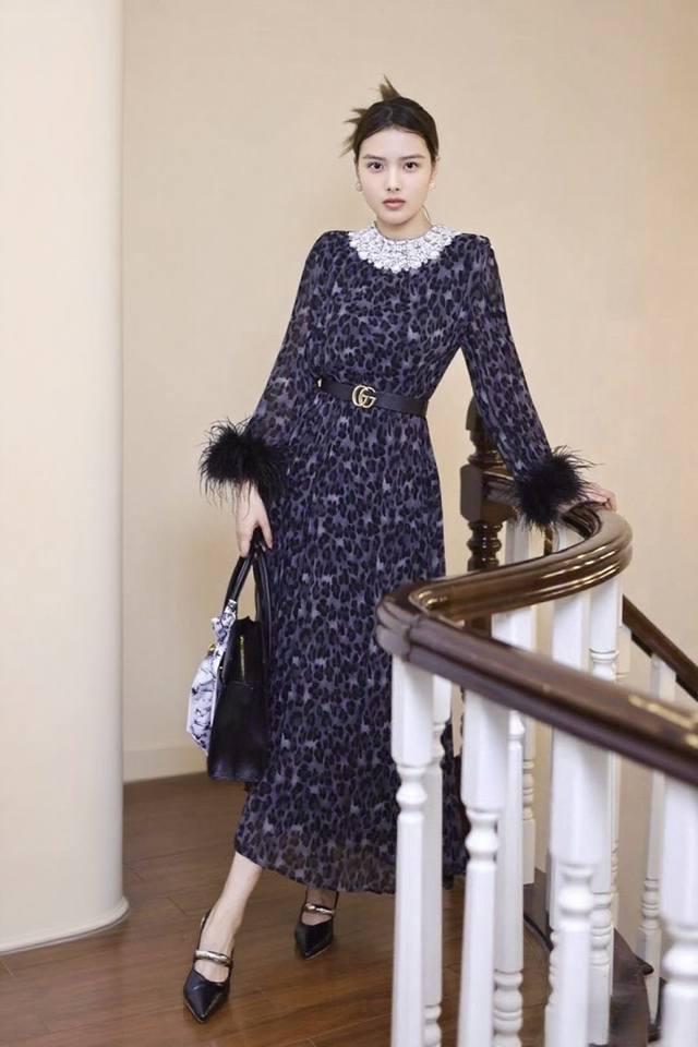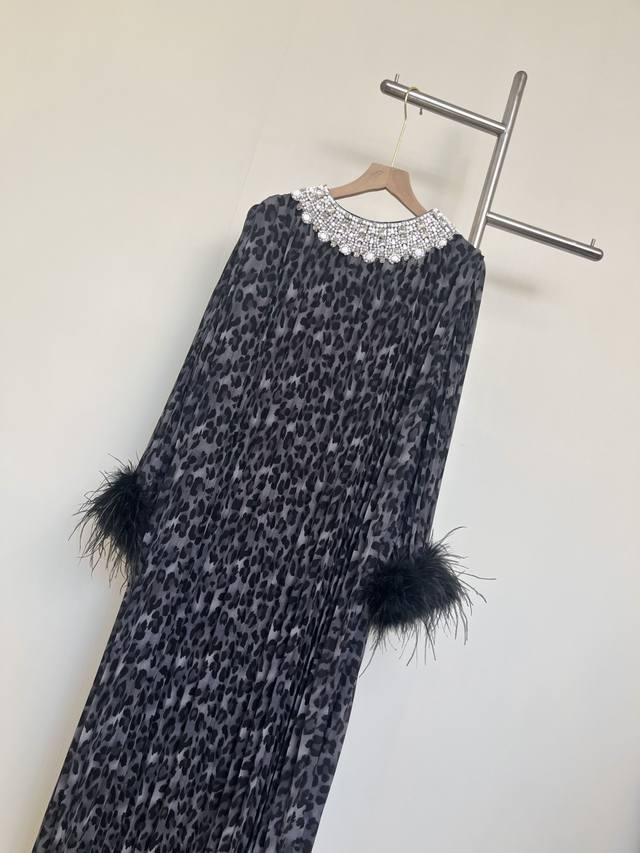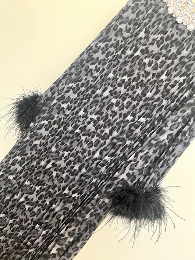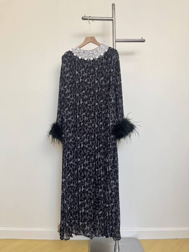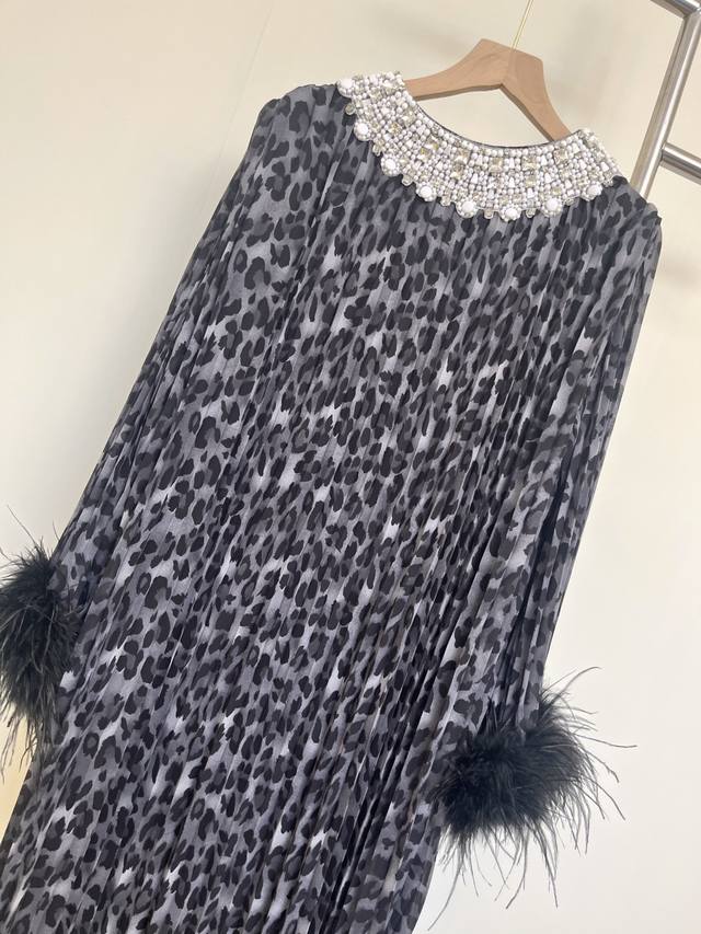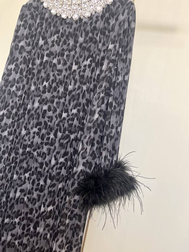This leopard print maxi dress features a unique leopard print base, a pearl collar for added elegance, and feather cuffs for a touch of opulence. A belt at the waist frames the figure. Paired with a handbag and high heels, the retro and trendy look effortlessly creates an eye-catching and sophisticated look perfect for a variety of occasions.