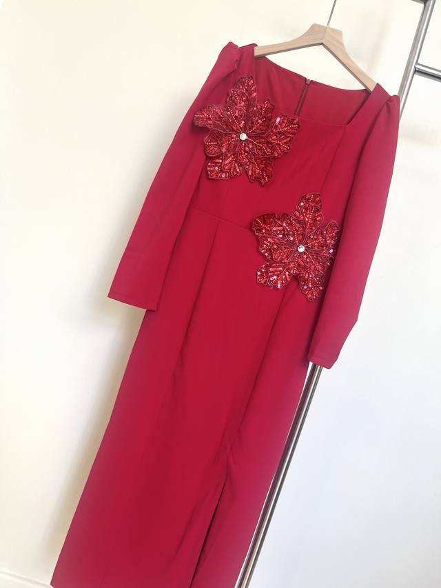 Set in a vibrant red, the square neckline frames an elegant neckline, while puff sleeves offer a touch of vintage charm. Hand-beaded floral embroidery accents the dress, while slits add a touch of movement. Every detail and embellishment is crafted to create a dress that embodies both elegance and romance, perfect for those special moments .