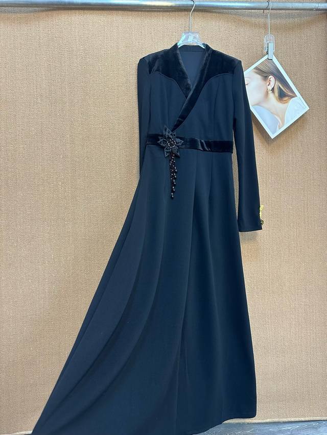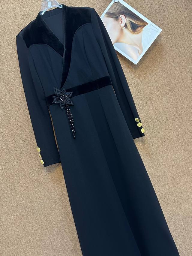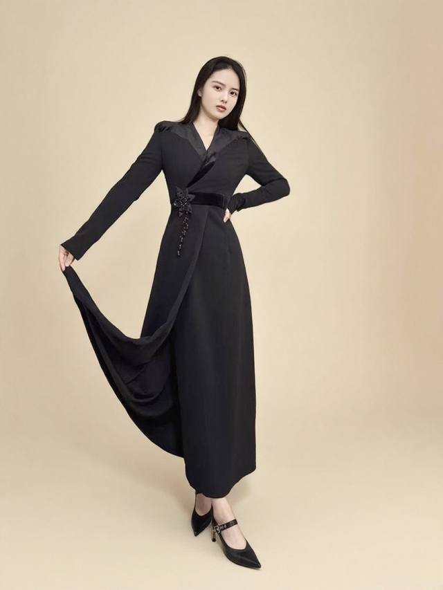 The black long skirt has a high-end feel. The velvet stitching and exquisite floral belt add details. The gold buttons on the cuffs make it more elegant. It can easily hold various formal occasions~