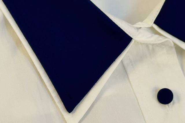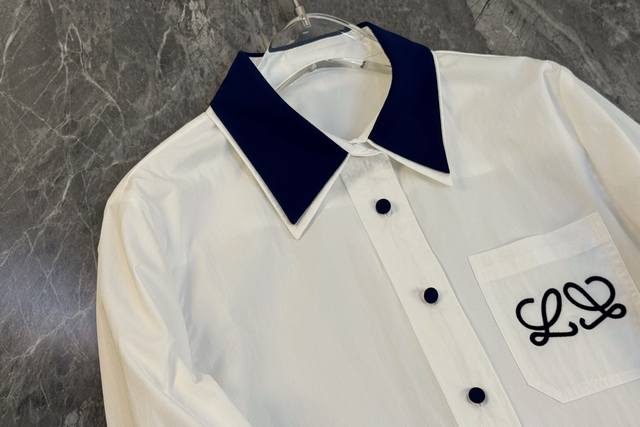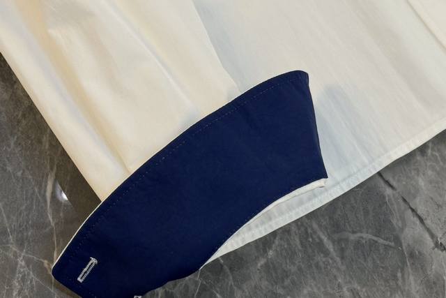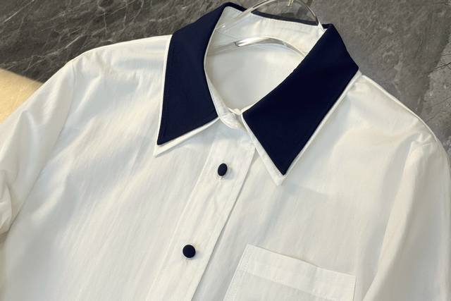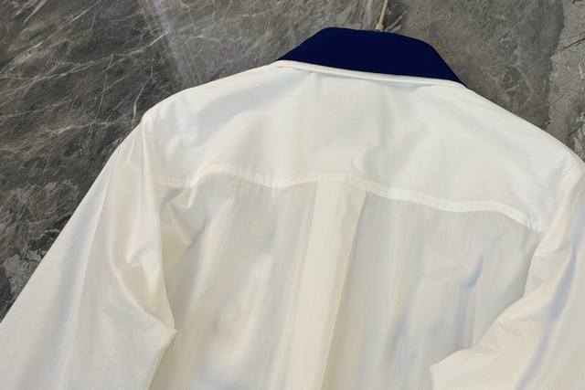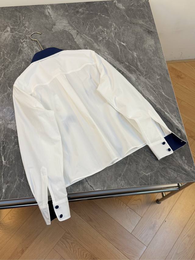 25 A perfect blend of new style and sophistication! This white shirt is absolutely stunning! It truly knows how to seamlessly blend retro and refined elements. The classic white base is understated and elegant, making it a versatile piece that goes with everything. The contrasting design at the collar and cuffs, with its deep blue trim, instantly breaks the monotony, adding a touch of playfulness and style. The details showcase unique taste. (Single color, Sml,
