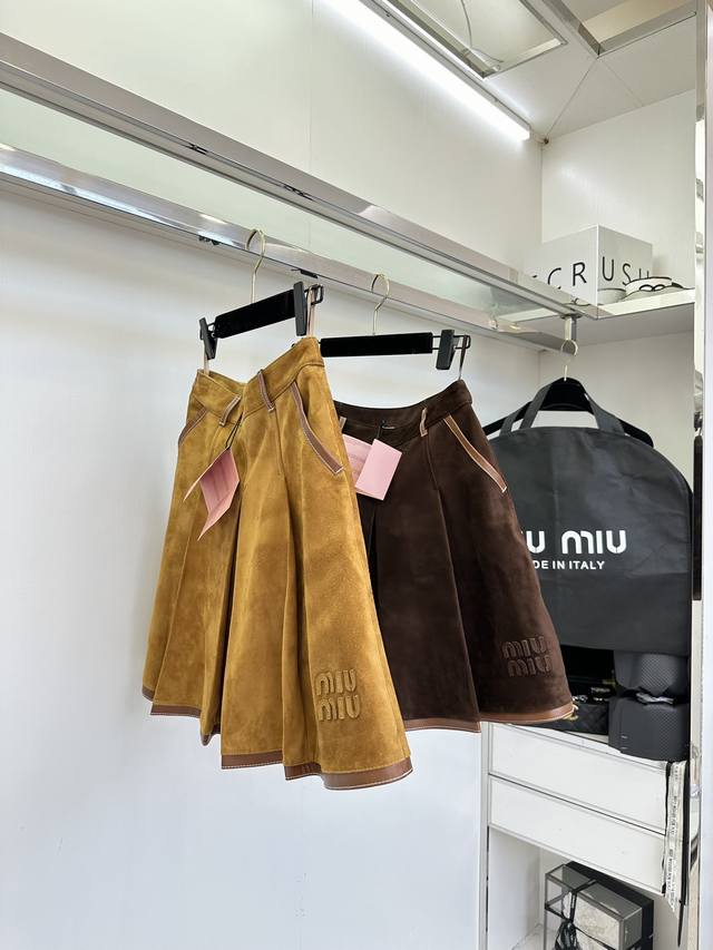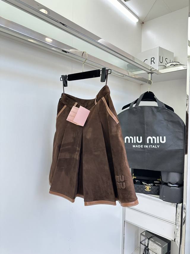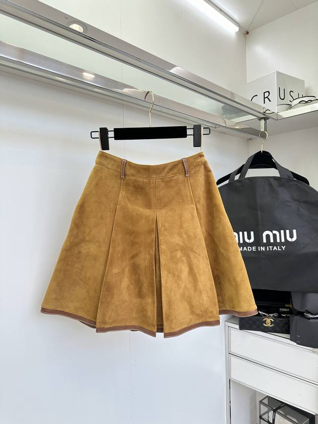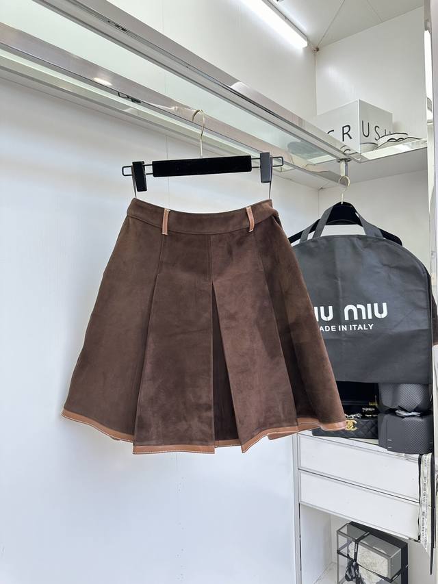 25 Af Miu Miu's Autumn/Winter New Style Suede Sheepskin Pleated Skirt. Imported Scottish goatskin suede, the leather is very soft and comfortable. The cut is excellent. The warm brown tone gives a warm and elegant feel. The three-dimensional logo adds depth to the overall look. The knee-length design makes it more dignified.