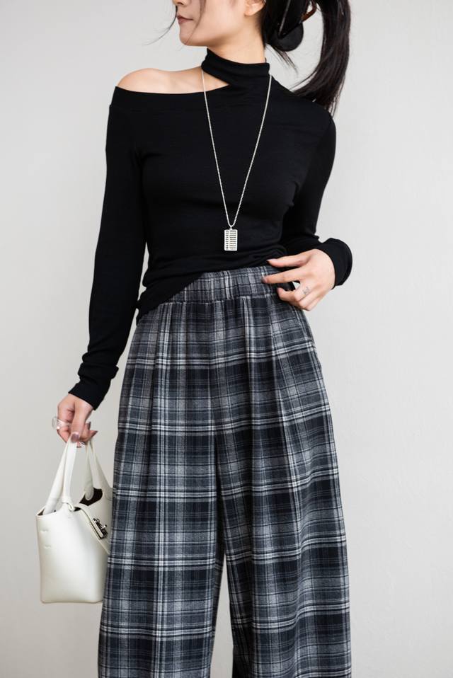 High Waist Elastic Waist Plaid Wide Leg Pants