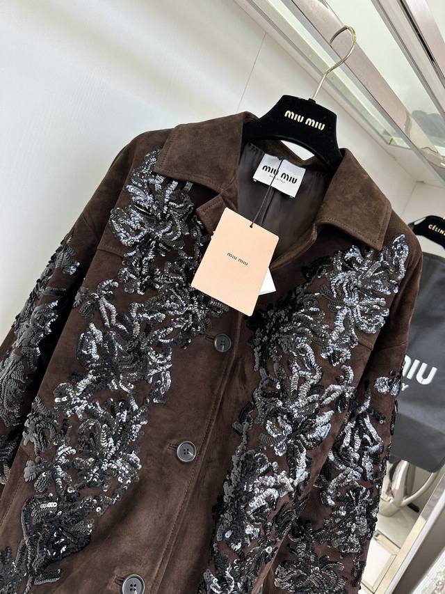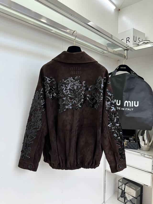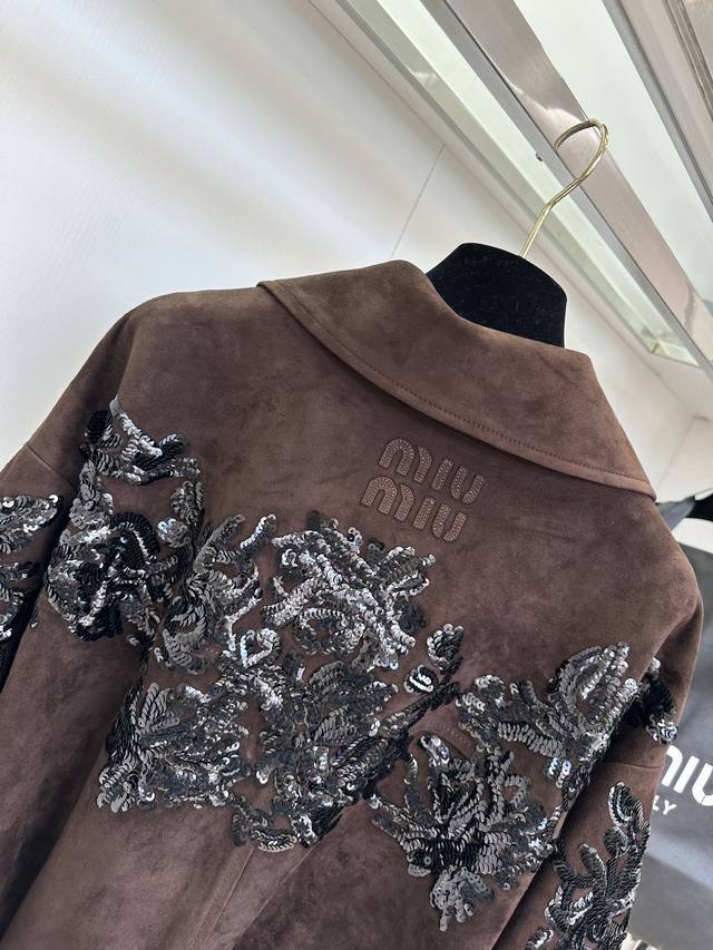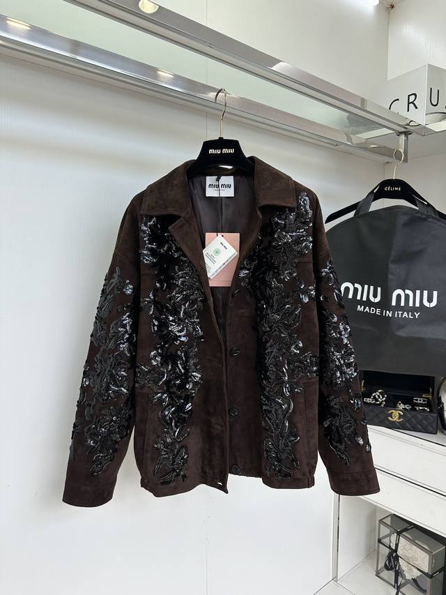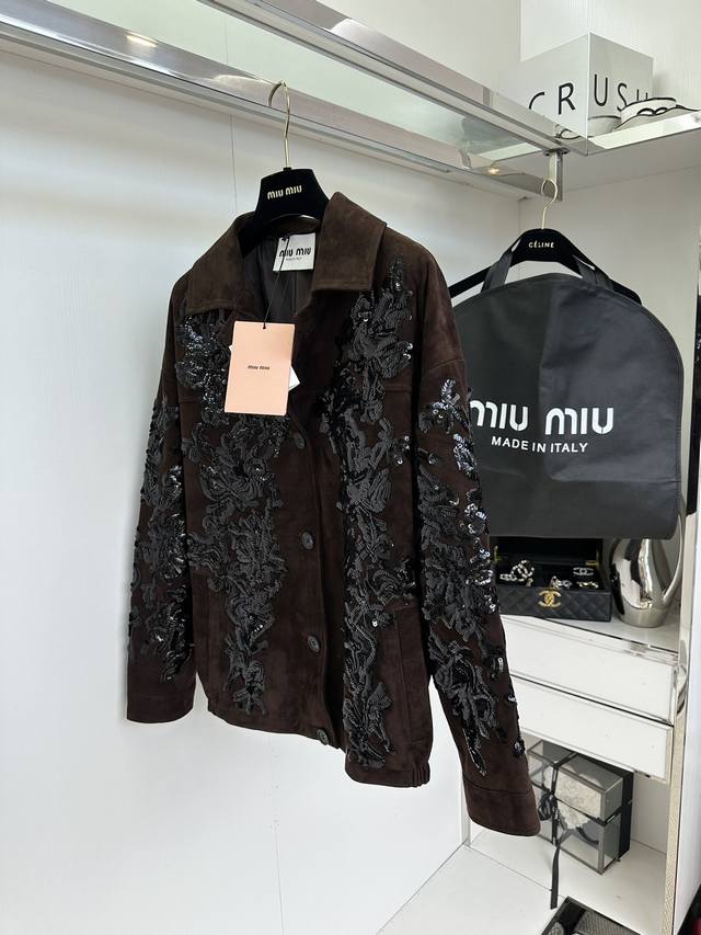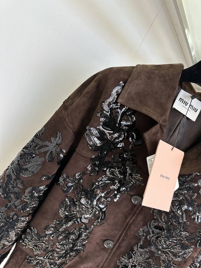 25 F The highlight, Miu Miu, really has the momentum. This leather jacket I've been eagerly awaiting, costing nearly 100,000 yuan, is incredibly hard to resist. The word "heavy craftsmanship" is enough to describe this entire piece. The Italian-imported suede, which took over two weeks to source, is a truly stunning masterpiece. The shearling itself is beyond imagination. The sequins alone took a month to sew and lay out. It's hard to imagine how many tens of thousands of stitches went into these densely packed sequins. The luxurious hues and shimmering sequins are truly captivating.