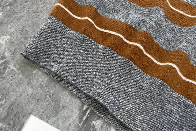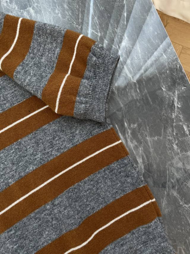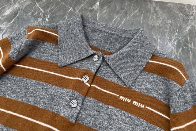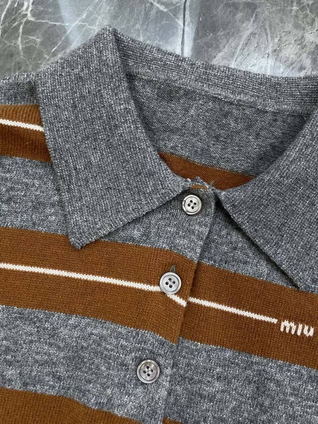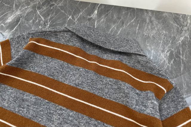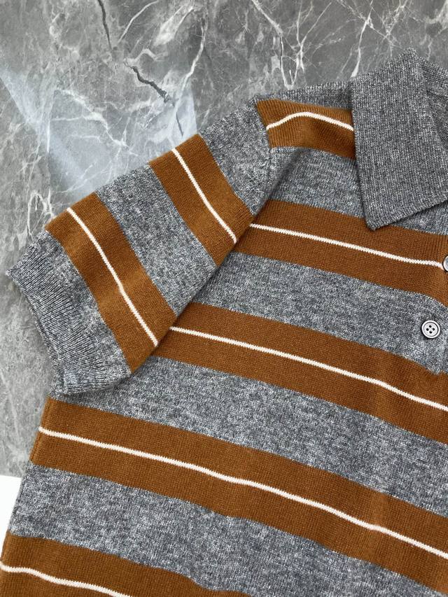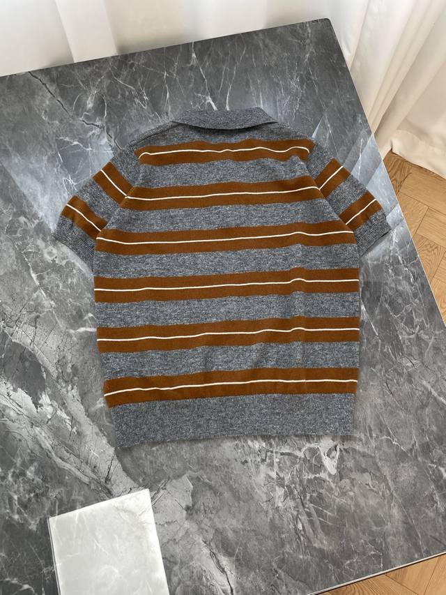 25 New Retro Striped Polo Collar Knit Short-Sleeve T-Shirt Unlocks a Fusion of Preppy Style and Subtle Luxury. This retro striped polo collar knit short-sleeve t-shirt features contrasting gray and brown stripes and exquisite details, creating a fashionable piece that combines preppy style with a touch of luxury. 1 color, 3 sizes available.