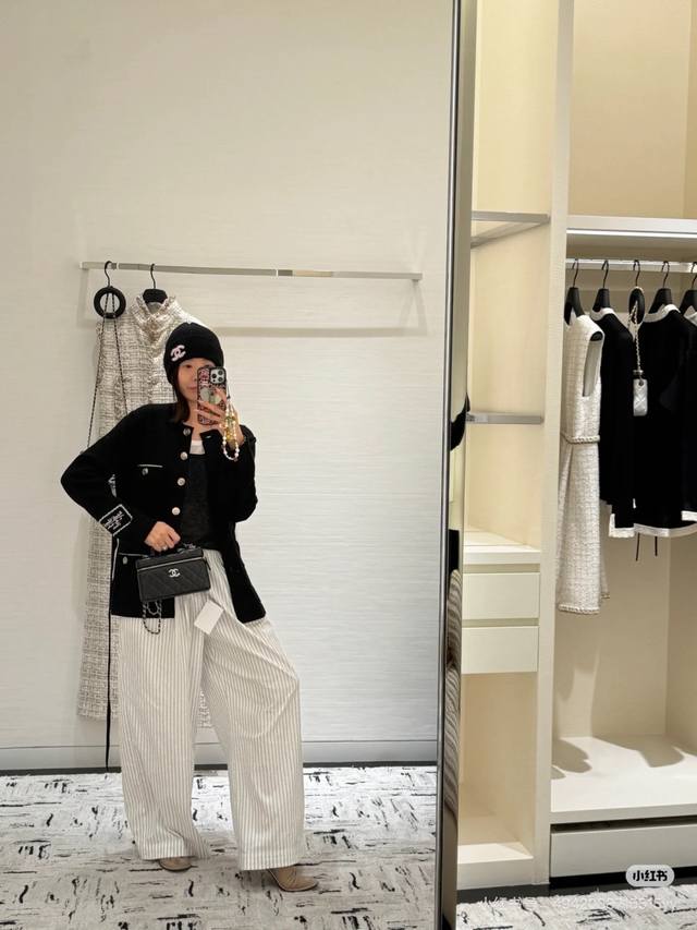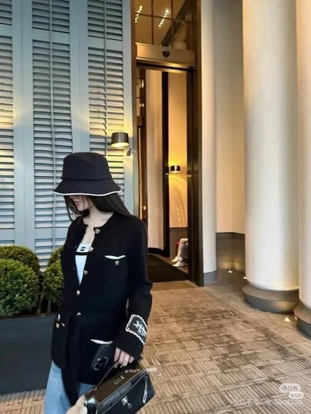/ 25B black and white metal button pocket contrast embroidery belt knitted cardiga