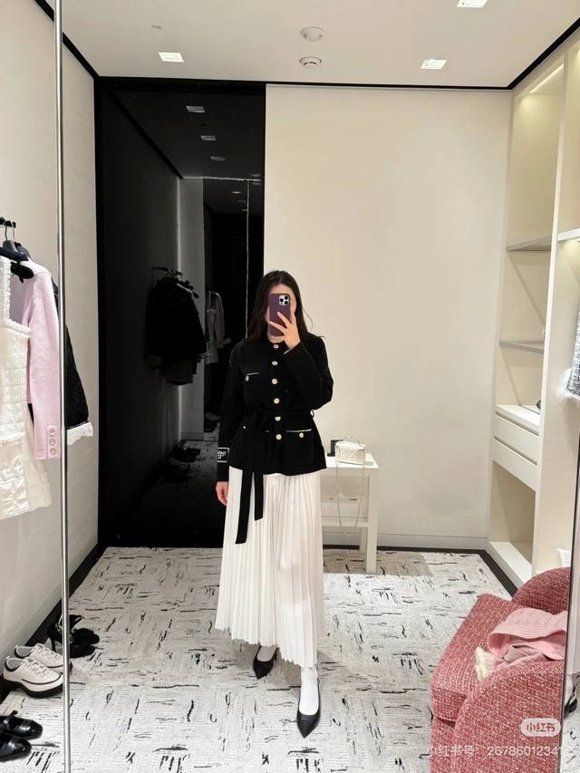 25B black and white metal button pocket contrast embroidery belt knitted cardigan Sml