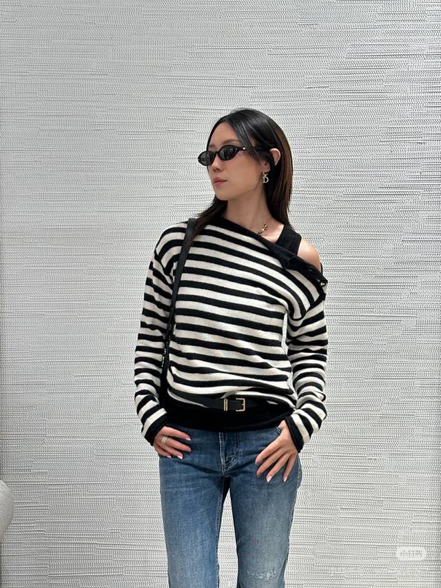 / 25Fw Autumn and Winter New Navy Style Shoulder Button Striped Knitted Sweater Wo