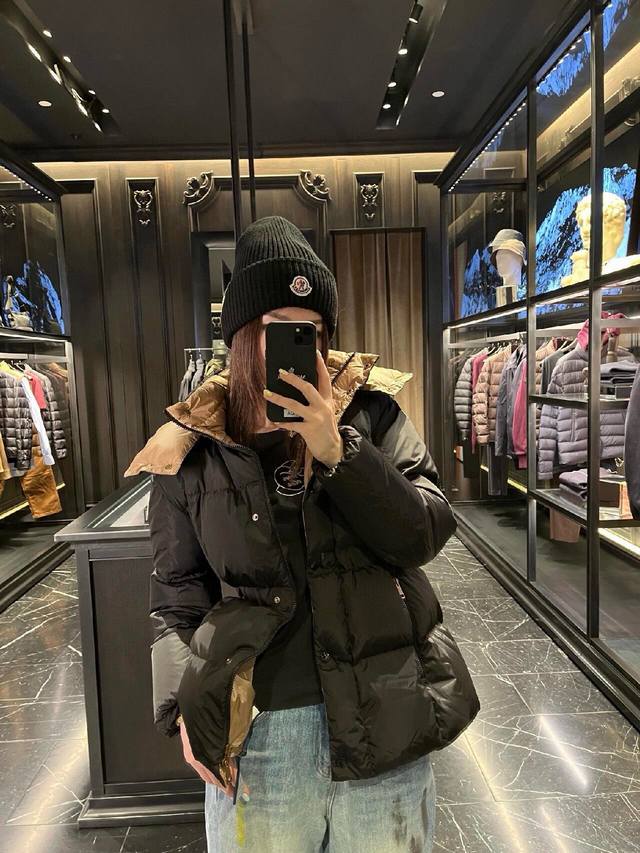 25Fw Autumn/Winter New Classic Slim-Fit Black and Gold Down Jacket, High-Quality! Made with pure black matte down fabric to create a clean silhouette, paired with a champagne gold color-blocked hood design. Two colors available, high-quality, guaranteed. (Sml DDD)