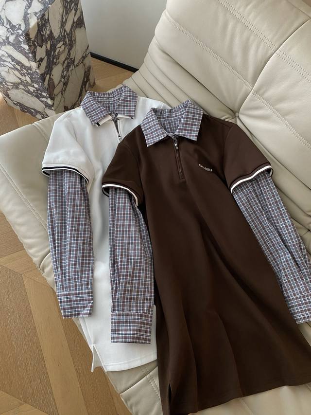25Pf Autumn/Winter Miu Color Block Plaid Lapel Loose Casual Dress, Blended Cotton Yarn Knit, Half Zipper Shirt Collar, Faux Two-Piece Look, Iconic Classic Letter Embroidery on the Chest, Slightly Loose Fit, H-Line, Very Forgiving, 2 Colors, 3 Sizes (