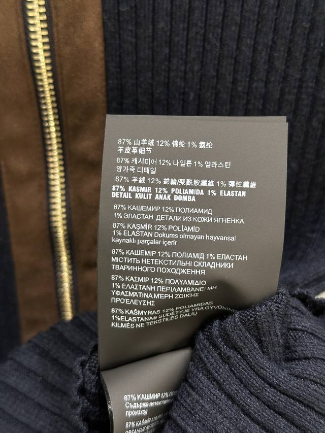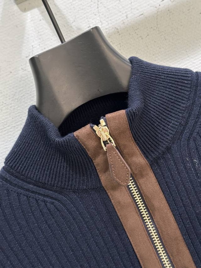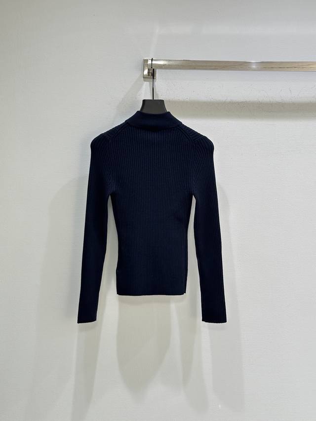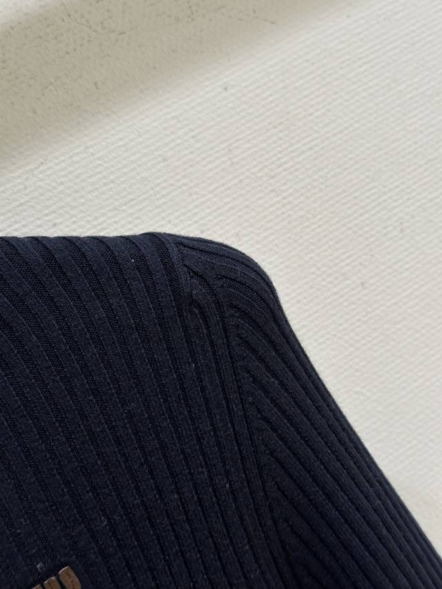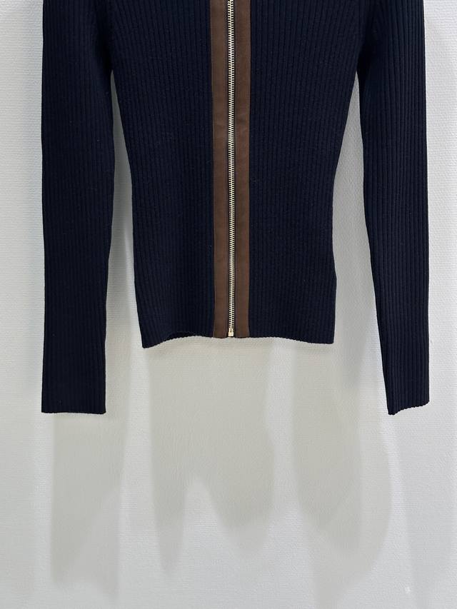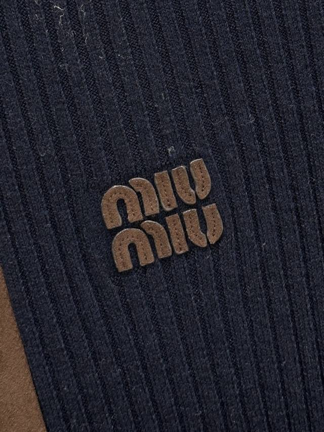 25Ss Autumn/Winter New Arrival! The exquisite ribbed knit craftsmanship defines the slim fit of this cashmere cardigan, while the leather trim on the collar, logo, and zipper subtly showcases Miu Miu's craftsmanship and modern aesthetics. Navy blue Sml DDD available in stock.