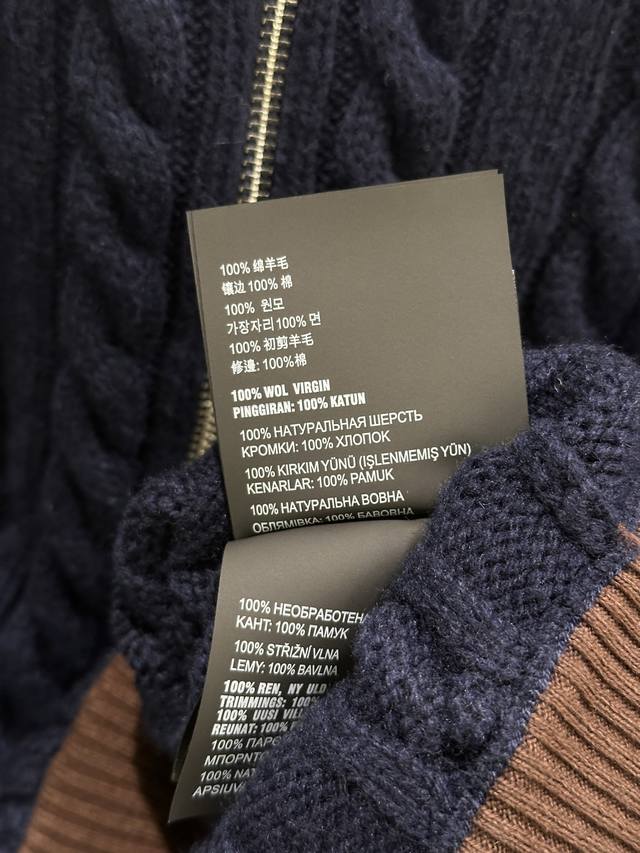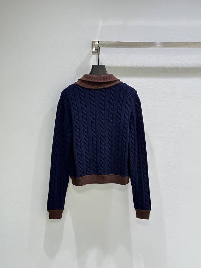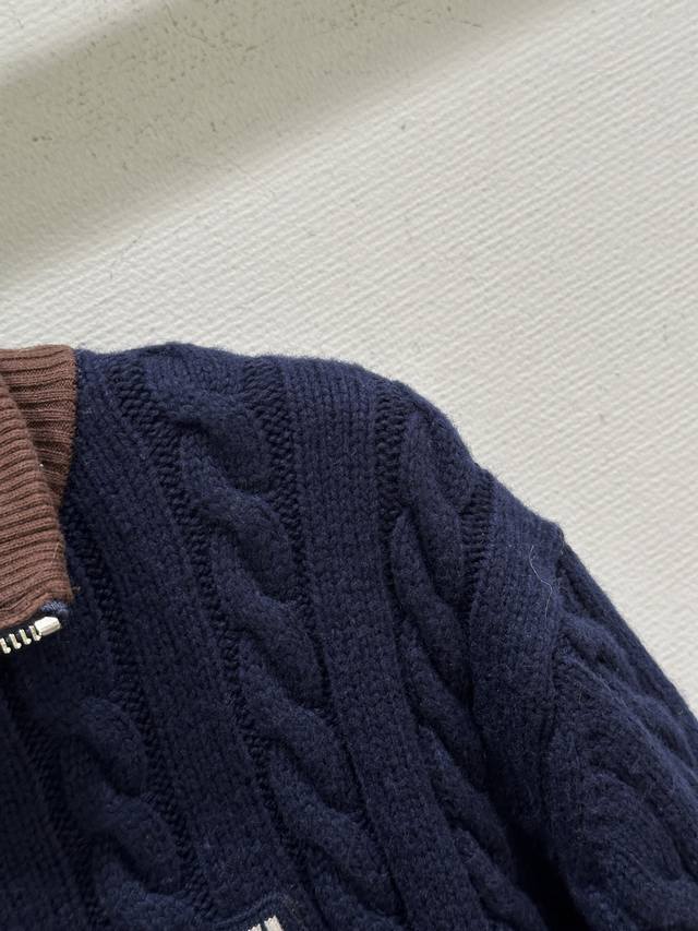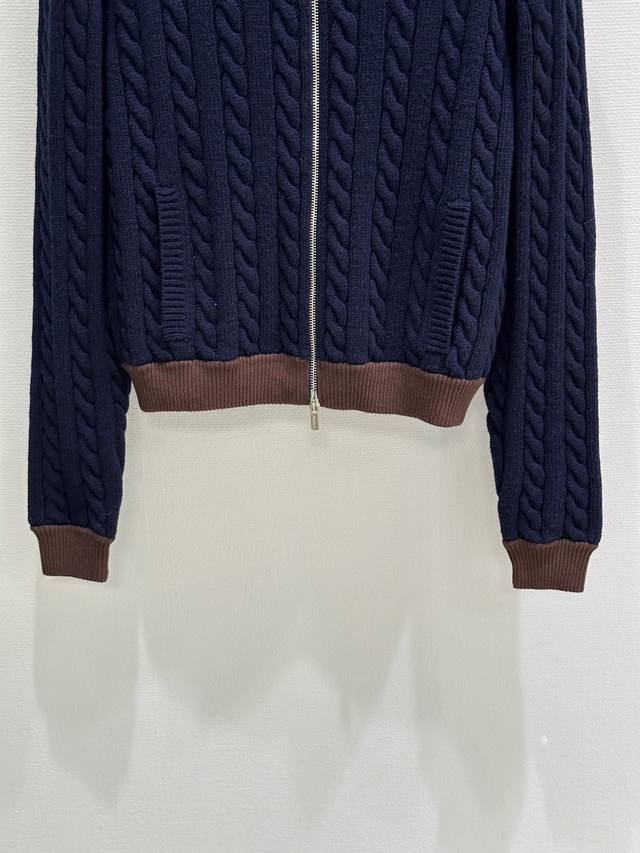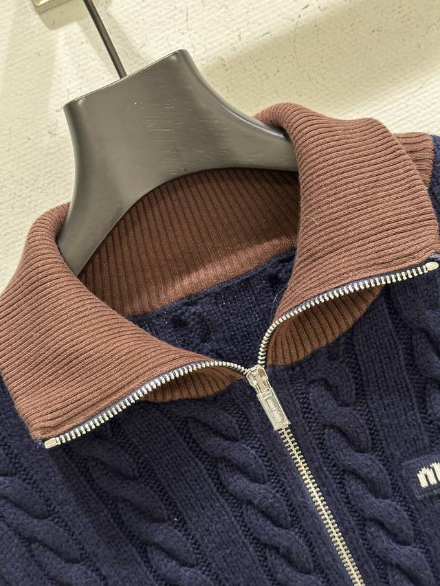 25Ss Autumn/Winter New Arrival! This cable knit zip-up jacket features a unique design, distinguishing it from other models on the market with a brand logo printed on the zipper. It also boasts a contrasting knit color-blocking design on the collar, cuffs, and neckline, with a slightly cinched waist. The dense cable knit is thick and textured, showcasing a high-quality craftsmanship. Available in navy blue (Sizes 1-15).