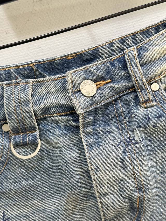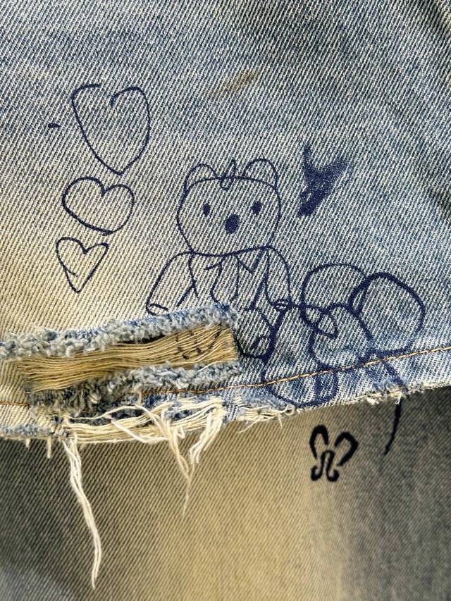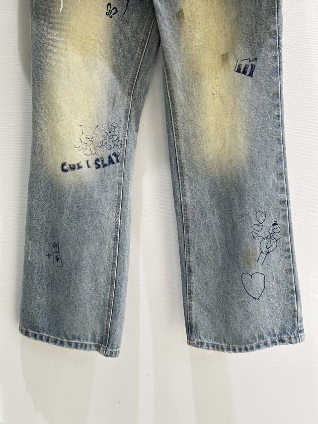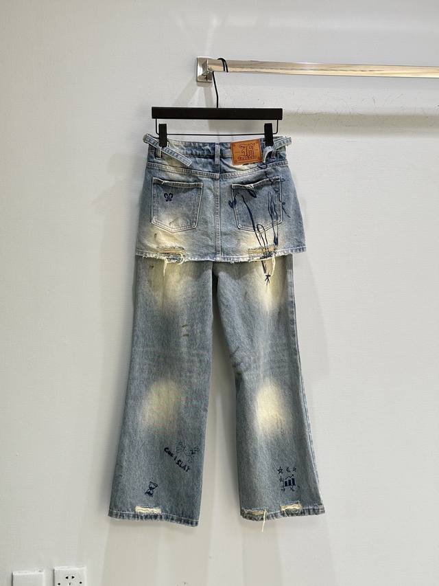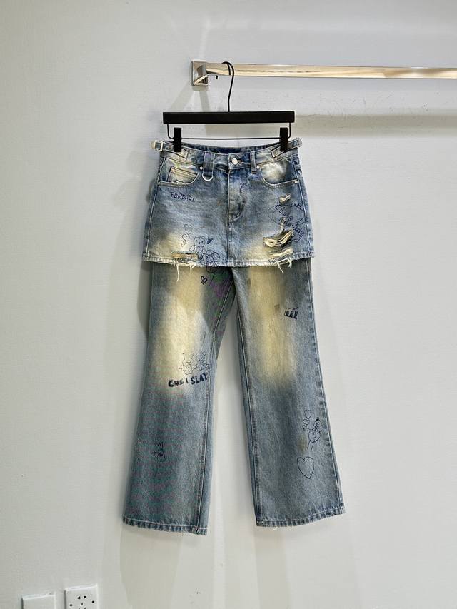 25Ss Early Autumn New Arrival! Playful ballpoint pen graffiti adorns layered faux two-piece culottes, combined with a distressed, ripped finish for a rebellious yet durable look. Heavy-duty distressed hand-painted culottes in blue, size Smlxl DDD