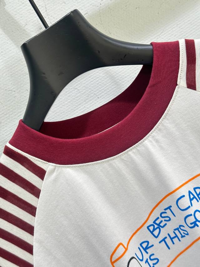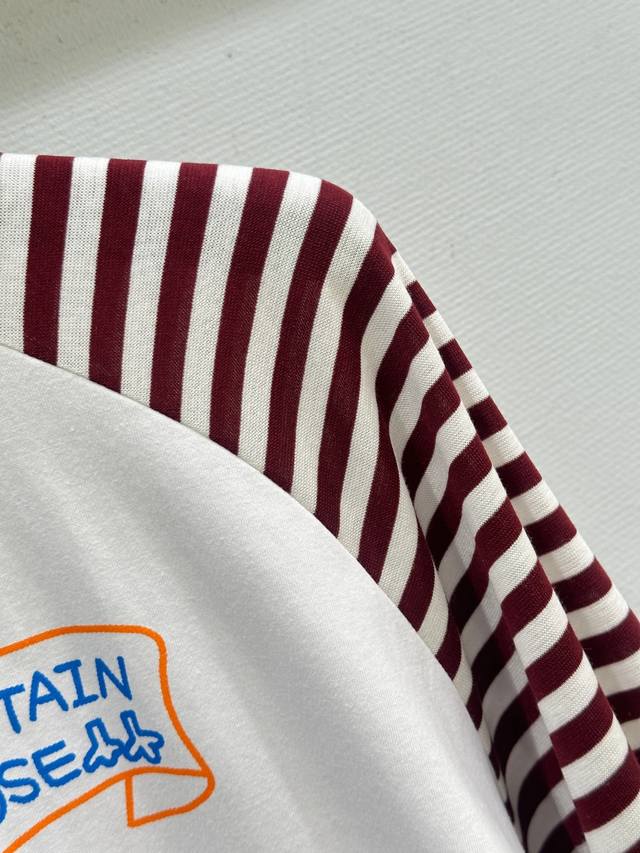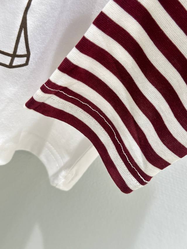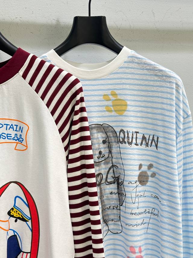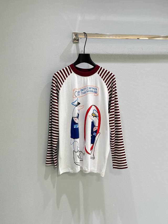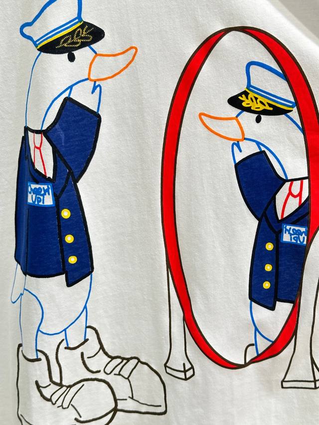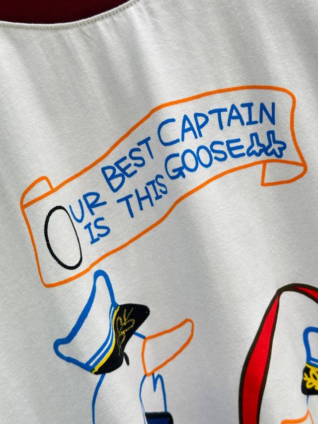 25Ss New summer style! Classic captain theme cartoon print, two geese captains wearing sailor hats saluting each other in front of the mirror, vivid and interesting, white background with burgundy pinstripe cuffs, simple yet fashionable! Available in white Sml