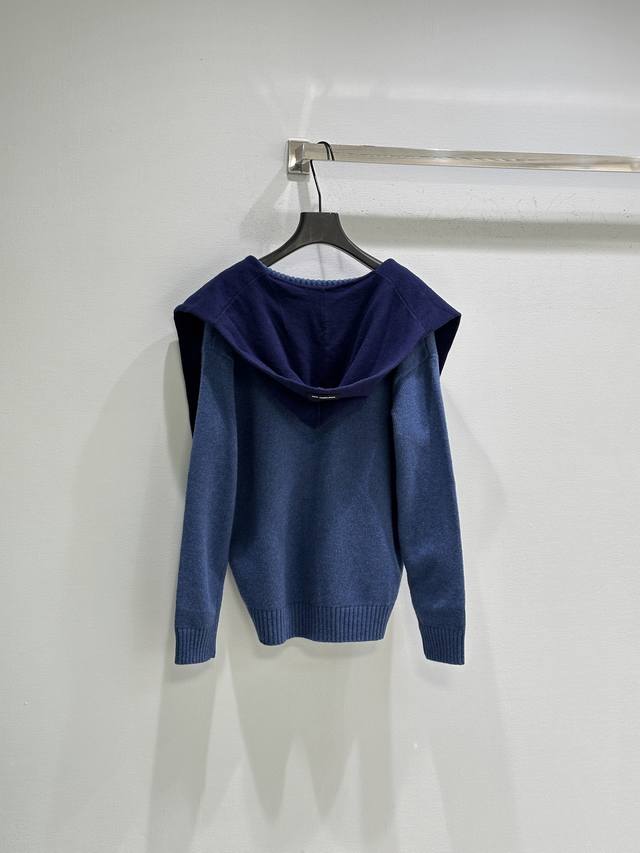 25Ss New Winter Arrival! Faux two-piece shawl-style hooded cardigan sweater, white embroidered logo on the chest, shawl in a darker shade for added depth, button closure, loose fit. Available in grey, blue, and red. Sizes: Sml DDD