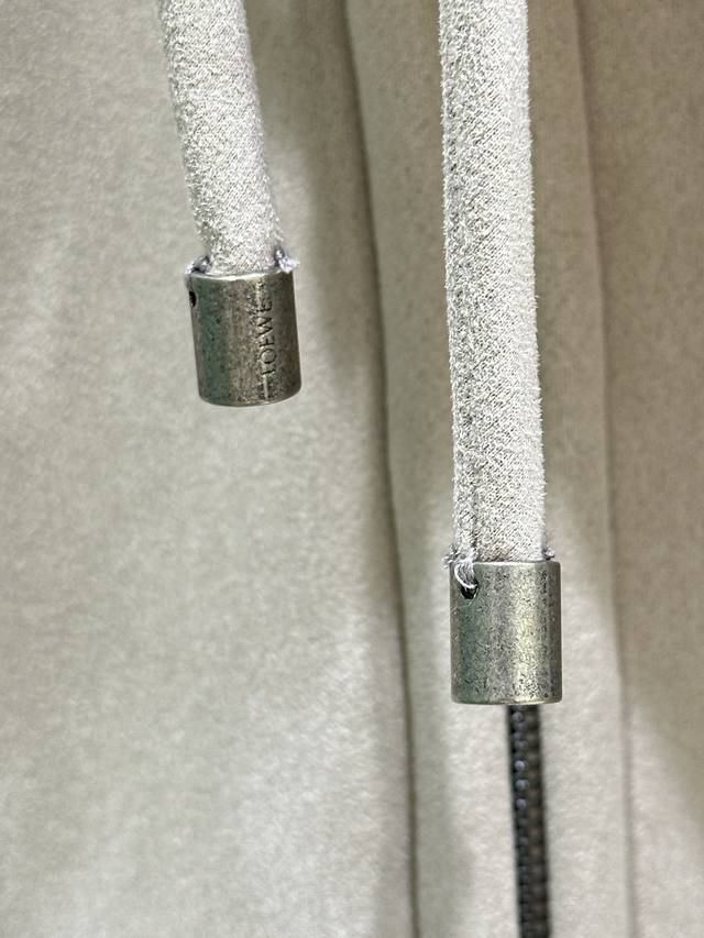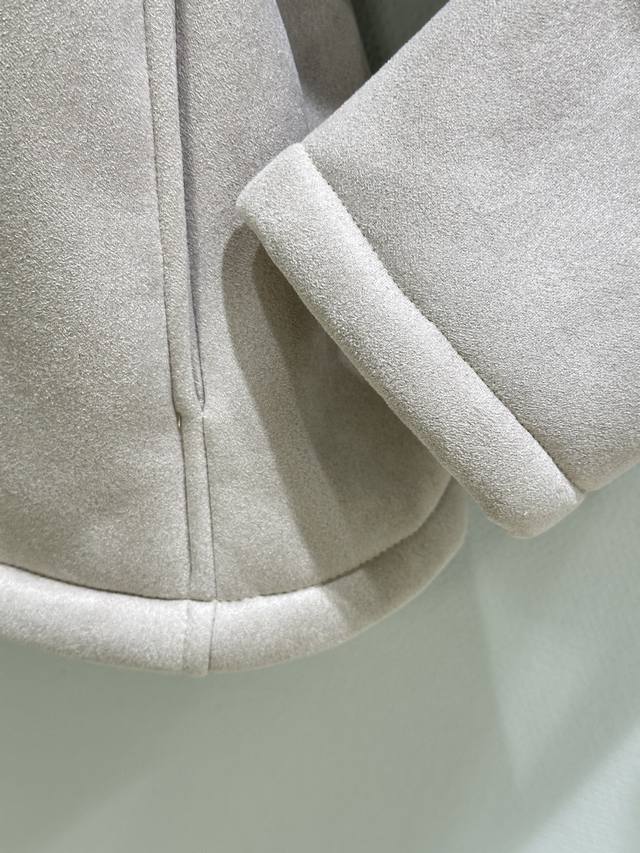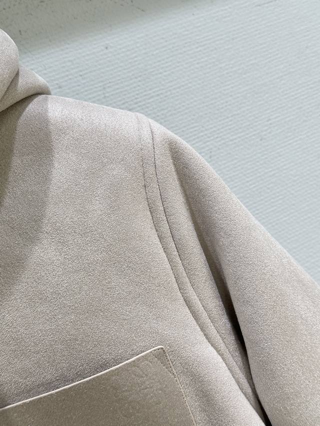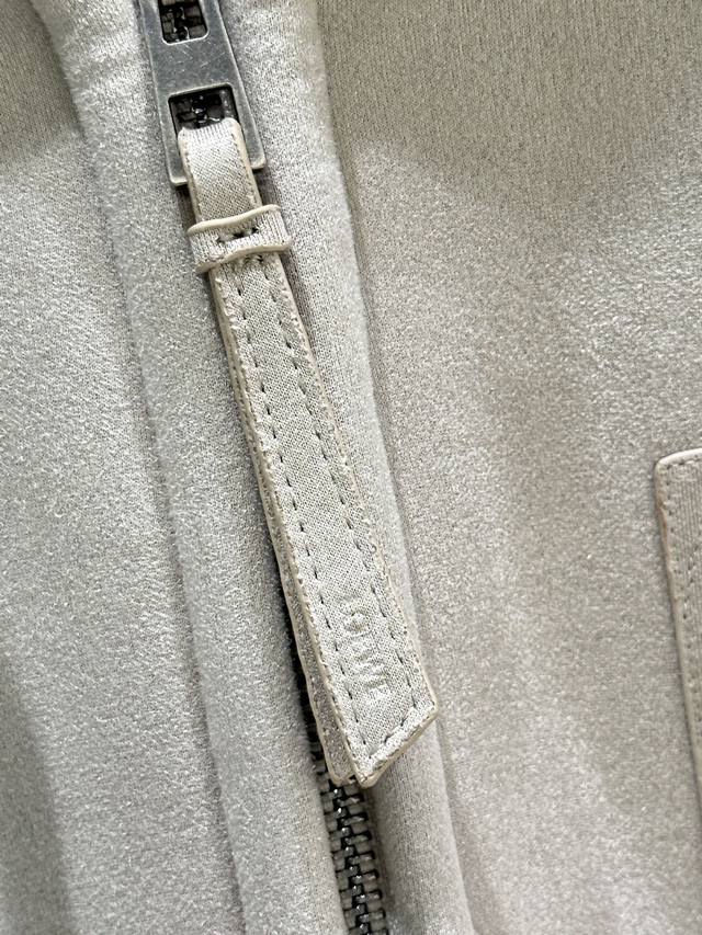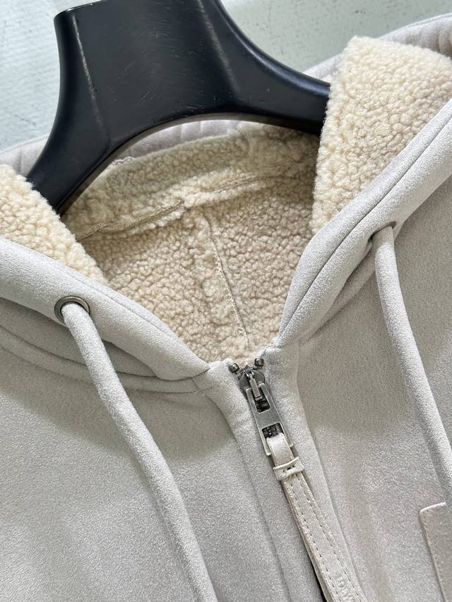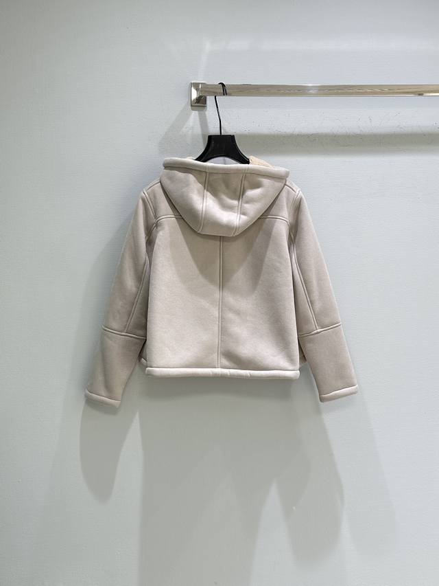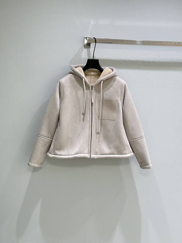 25Ss New Winter Arrival! Medium-weight curly merino shearling jacket with a trapezoidal silhouette. Relaxed fit, short drawstring hood, front zip closure with leather zipper pulls, chest patch pocket, and Anagram embossed chest pocket. Available in grey (Small, Medium, DDD).