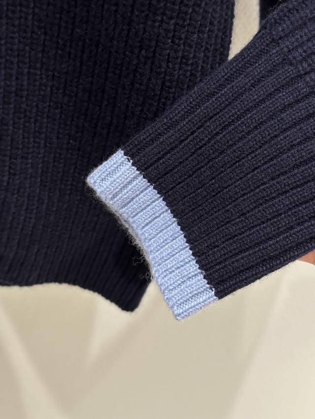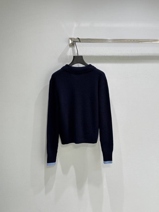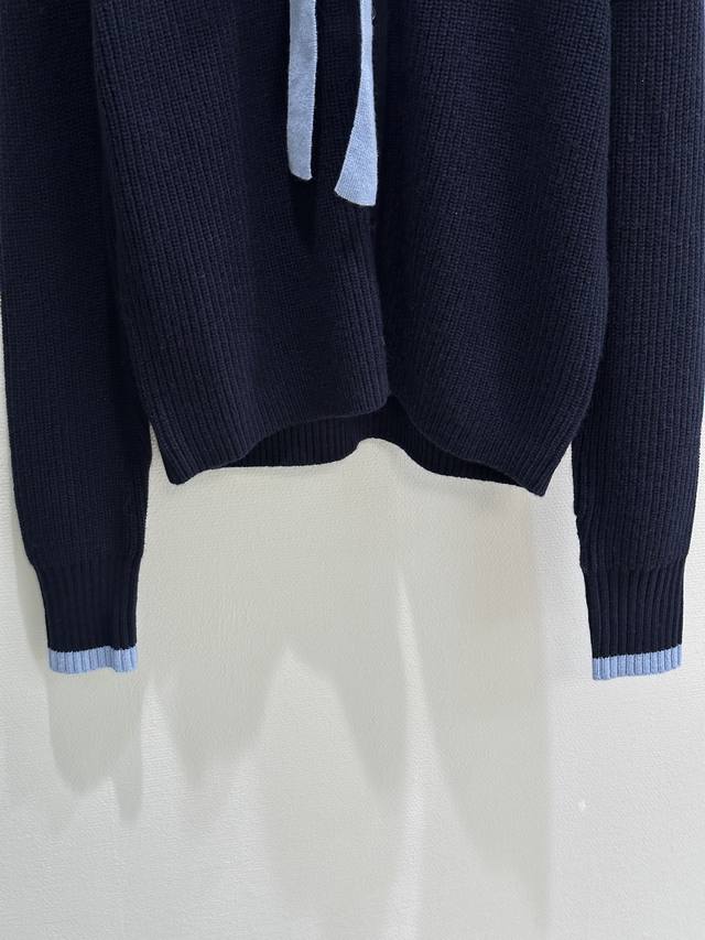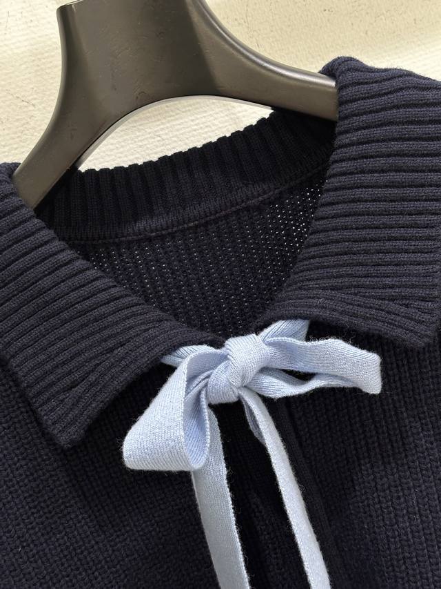 25Ss New Winter Arrival! This sweater features a light blue satin bow at the neckline, exuding a French retro feel, while the contrasting trim on the cuffs adds a touch of elegance. The soft and warm wool material is perfect for autumn and winter. The minimalist lettering on the chest adds a touch of understated sophistication. Available in blue ( Sizes S, M, D).