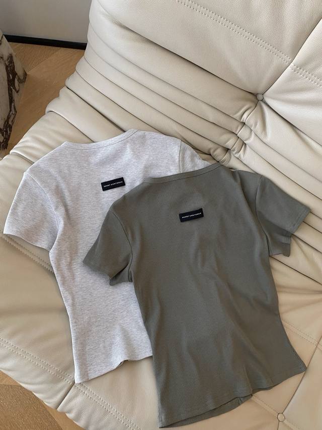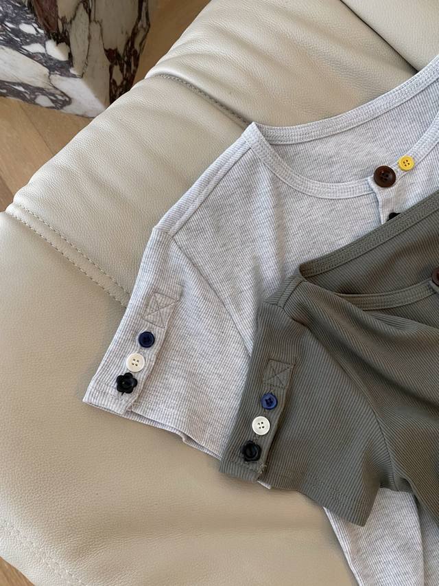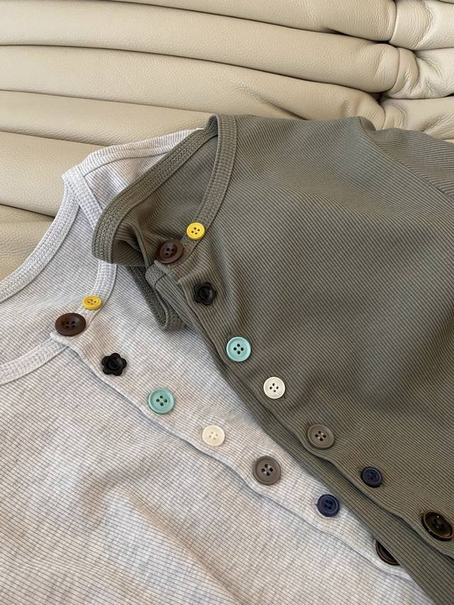 25Ss Spring and Summer Colorful Button Open T-shirt Made of cotton blend with vertical stripes and a little bit of elasticity Round collar Button placket with colorful buttons Slightly slim fit Cut to make you look slimmer and not monotonous 2 colors and 3 sizes