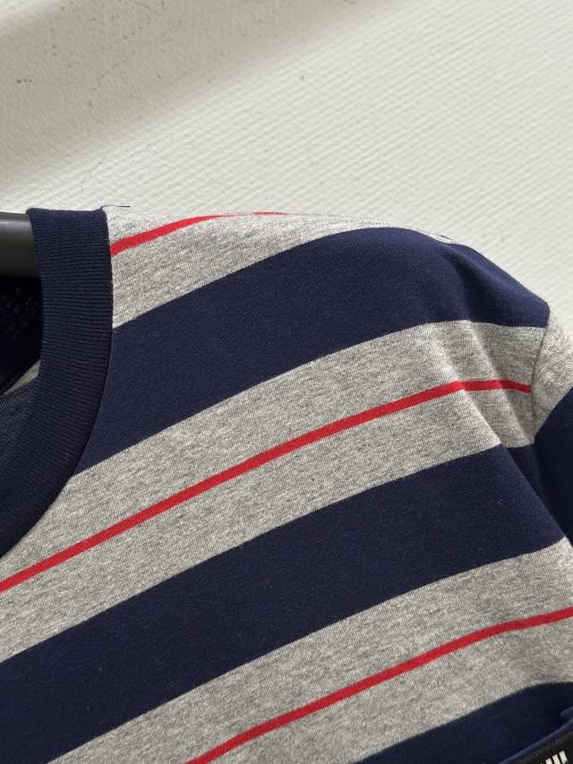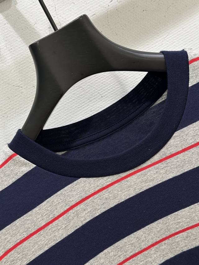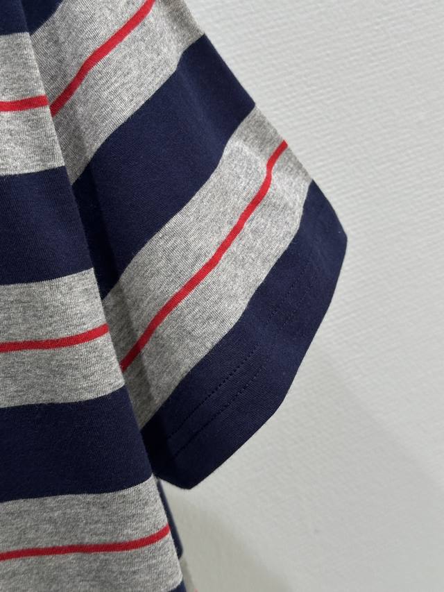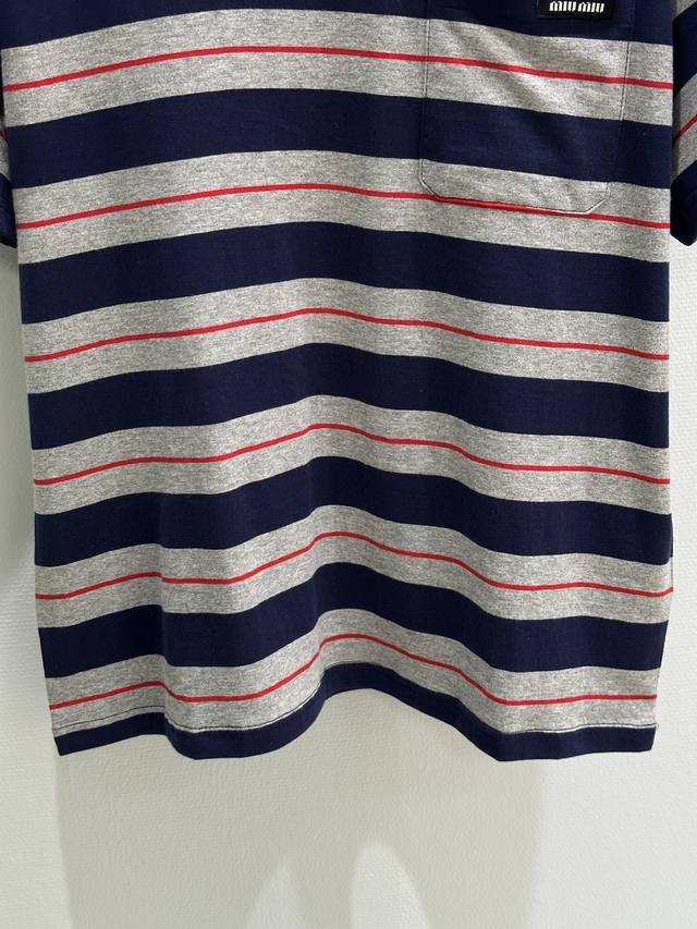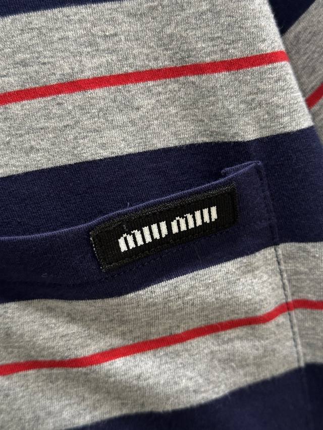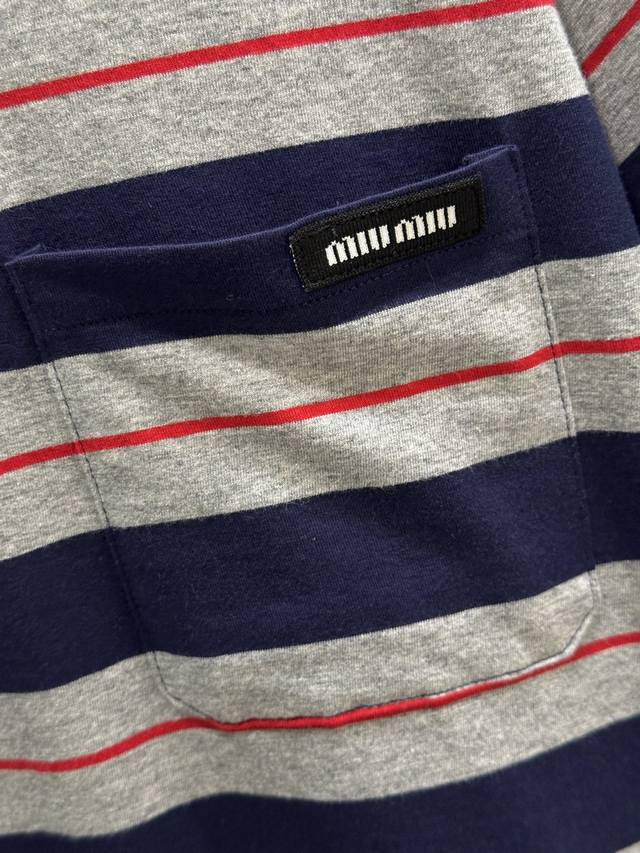 25Ss Spring and Summer new arrival! The simple oversized lines of this T-shirt contrast sharply with the Miu logo, showing a unique classic style. The navy blue and gray with red pinstripe in the middle are retro and modern colors. Available in blue Sml