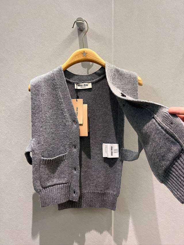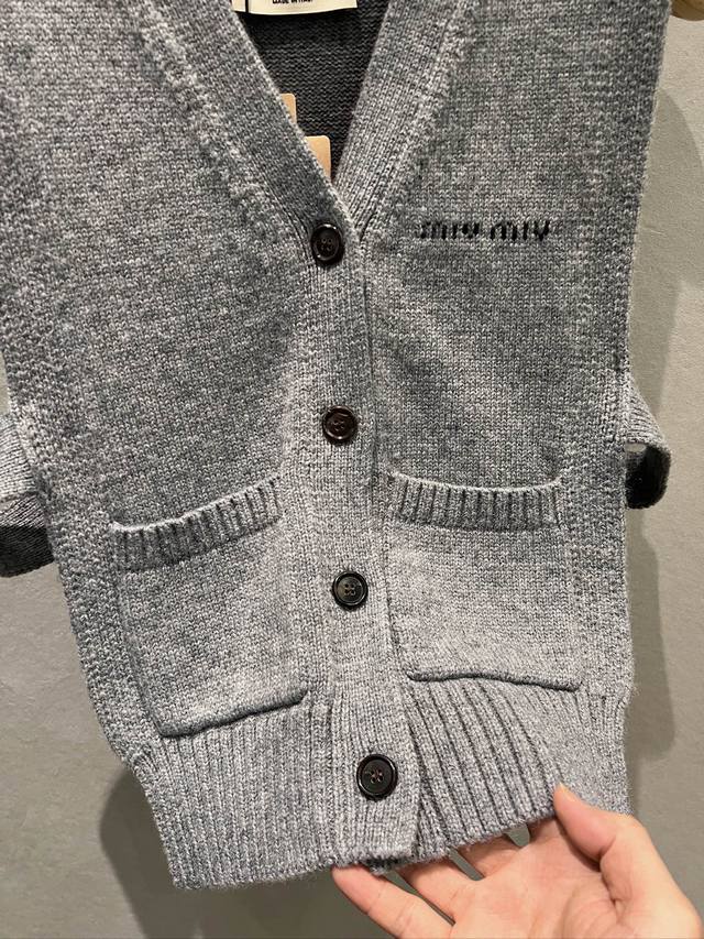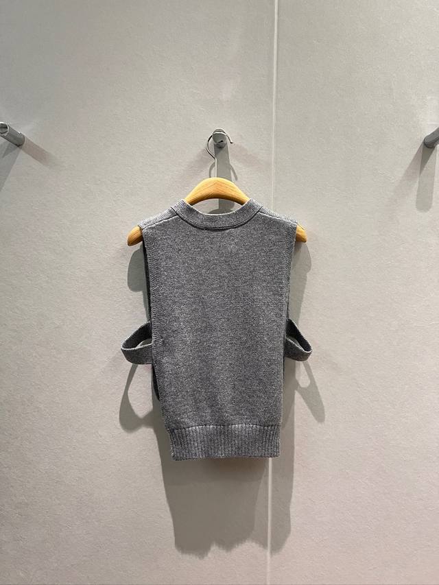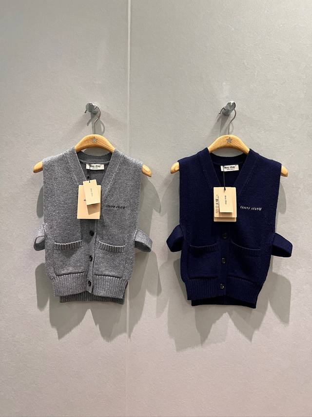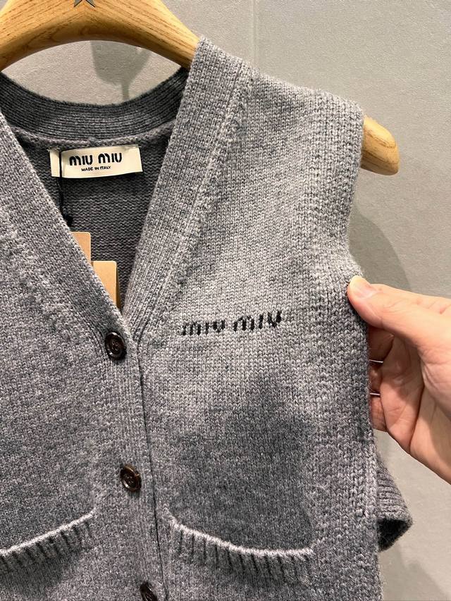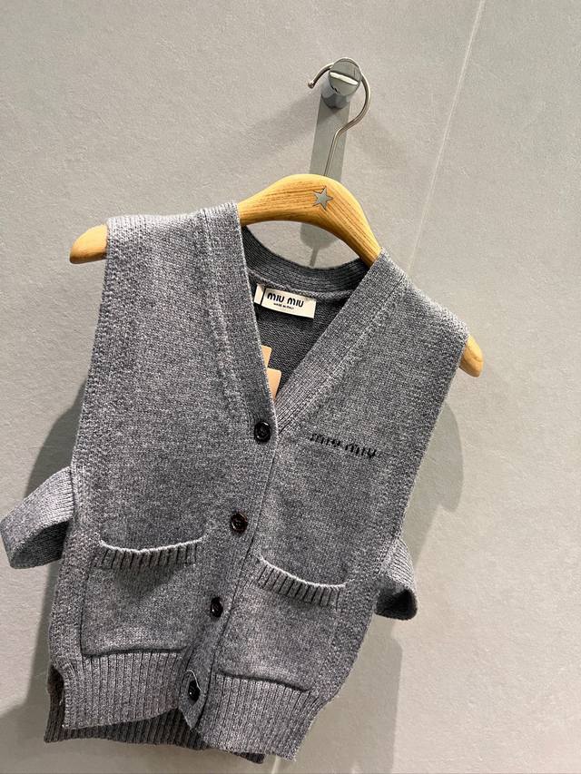 26 New Early Spring Runway Style V-neck Knitted Wool Vest with Hollowed-out Sides and Embroidered Miu Logo on the Chest. Stylish and youthful, a must-have for Miu-style outfits. Dark blue-grey, S/M/L.