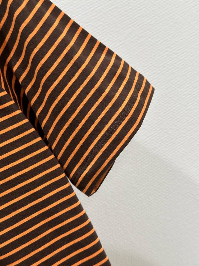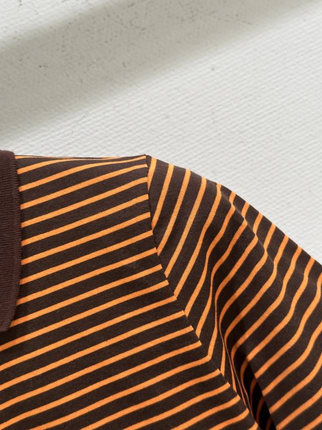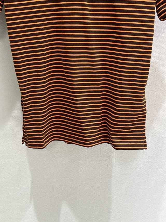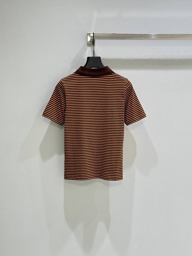 26Ss Early Spring New Arrival! This striped polo collar short-sleeved top features a knitted collar and a cotton body. The Maillard color is incredibly flattering and makes your skin look brighter. It has a slim fit and an embroidered logo on the chest. It can be layered or worn alone. Available in brown, sizes S, M, L, DDD.