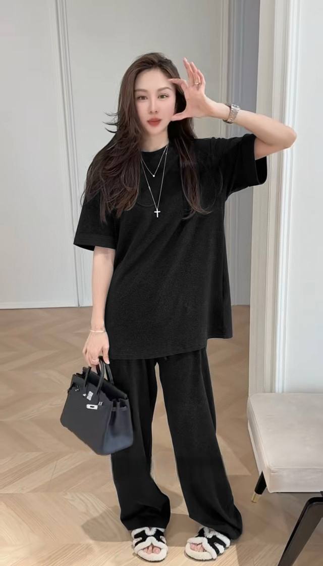 A black casual suit with a lazy atmosphere. The loose black T-shirt has a crisp and natural pleated design, which adds a sense of casualness. It is paired with wide-leg trousers in the same color, which has a full drape. It can effectively modify the leg lines and visually make you look longer in seconds. A comfortable and simple suit. Smlxl