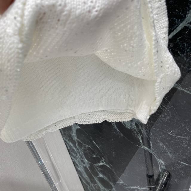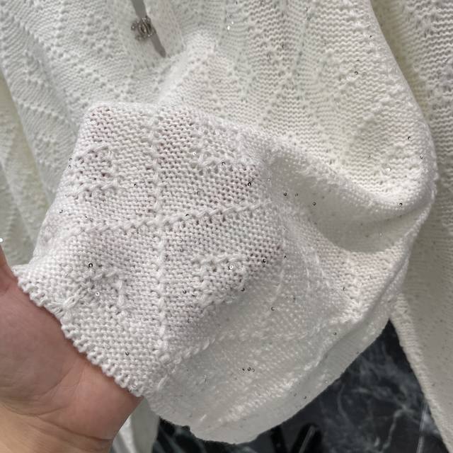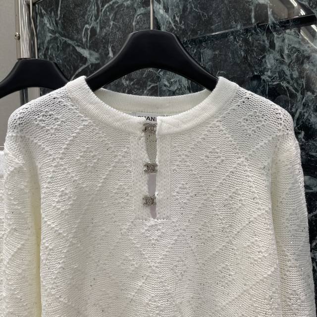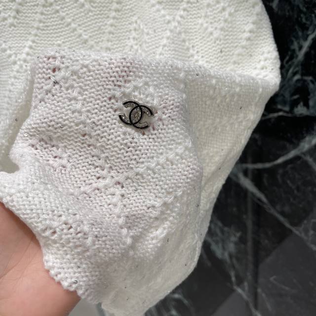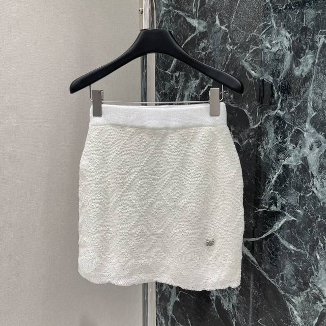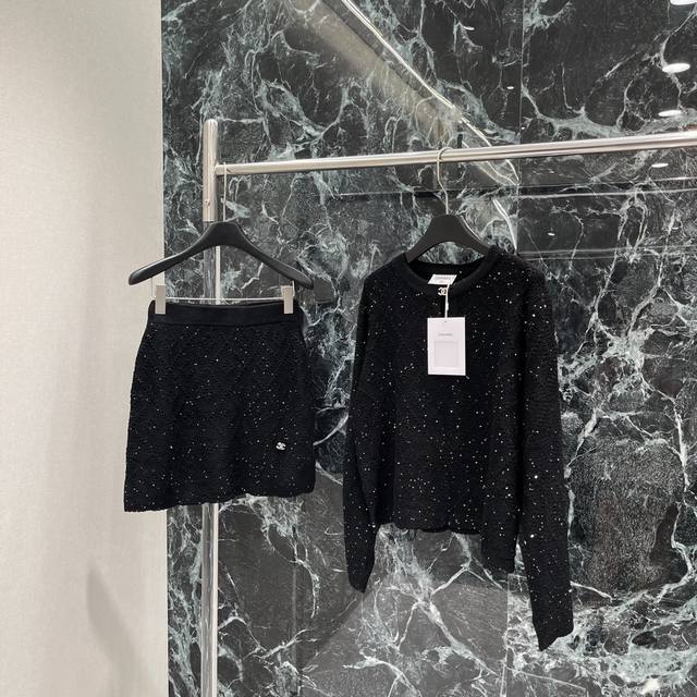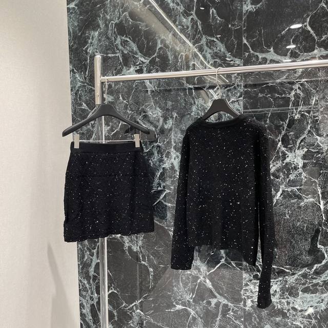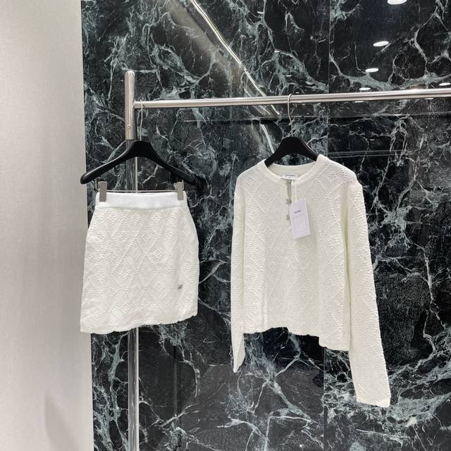 A set of Chanel's new early fall 2025 knitted top and skirt set featuring a sli