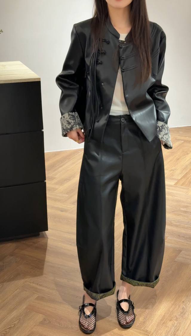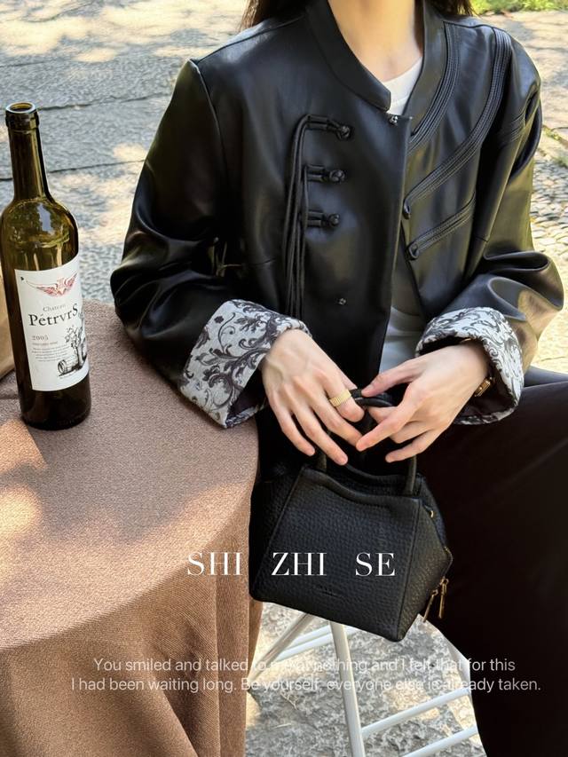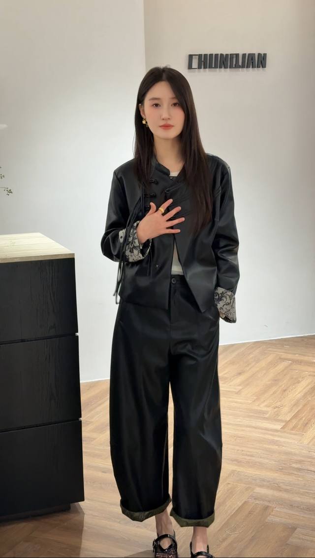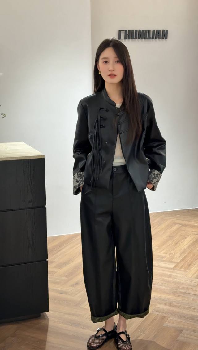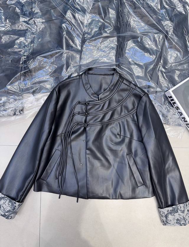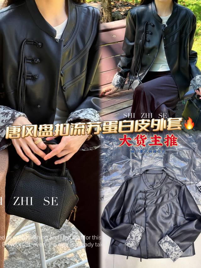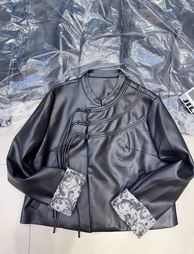 A Tang-style buttoned and tasseled protein leather jacket. The matte leather condenses into a cool base, and the lines of the stand-up collar outline the oriental charm. The Tang-style buttons are like the dark lines of time, locking the thousand-year aesthetic into the body of the jacket. The drooping tassels are a smart footnote, swaying lightly with the gesture, creating a poetic sense of alienation between the hard and soft pleats of the leather, because this swaying makes it more vivid and tense. The ink-colored patchwork on the cuffs hides a mystery. The traditional pattern is reconstructed with modern composition, like the elegant ripples of an ink pool. The buttons and tassels are stained with the lingering Tang style. Putting it on, you will have the calm and elegant style of a heroine. Smlxl